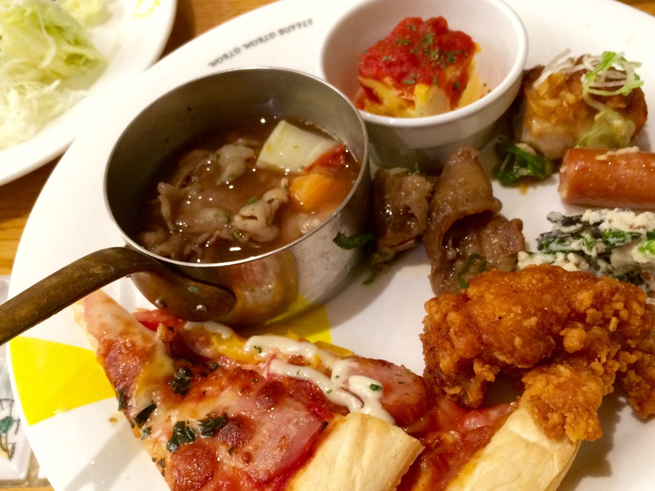 料理は基本的にはイタリアン中心で、ピザやパスタは温かい作り立てを常に何種類か食べることができました。変わり種としては青空カレーです。青いカレーです。食べ物としてはあまり食欲をそそられない色ですが、カレーとしては意外と美味しいです。また、クレープをその場で焼いてくれたりと見た目にも楽しい要素がたくさんあります。店内の雰囲気も落ち着いていてのんびり食べられます。