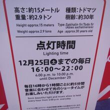 ひろおサンタランド(北海道広尾郡広尾町)から寄贈を受けた高さ約15mのトドマツに、彩り豊かなオーナメントと、LEDが煌びやかで心温まるクリスマスツリーを演出します。また音楽と光のショータイムで幻想的な世界へと導きます。