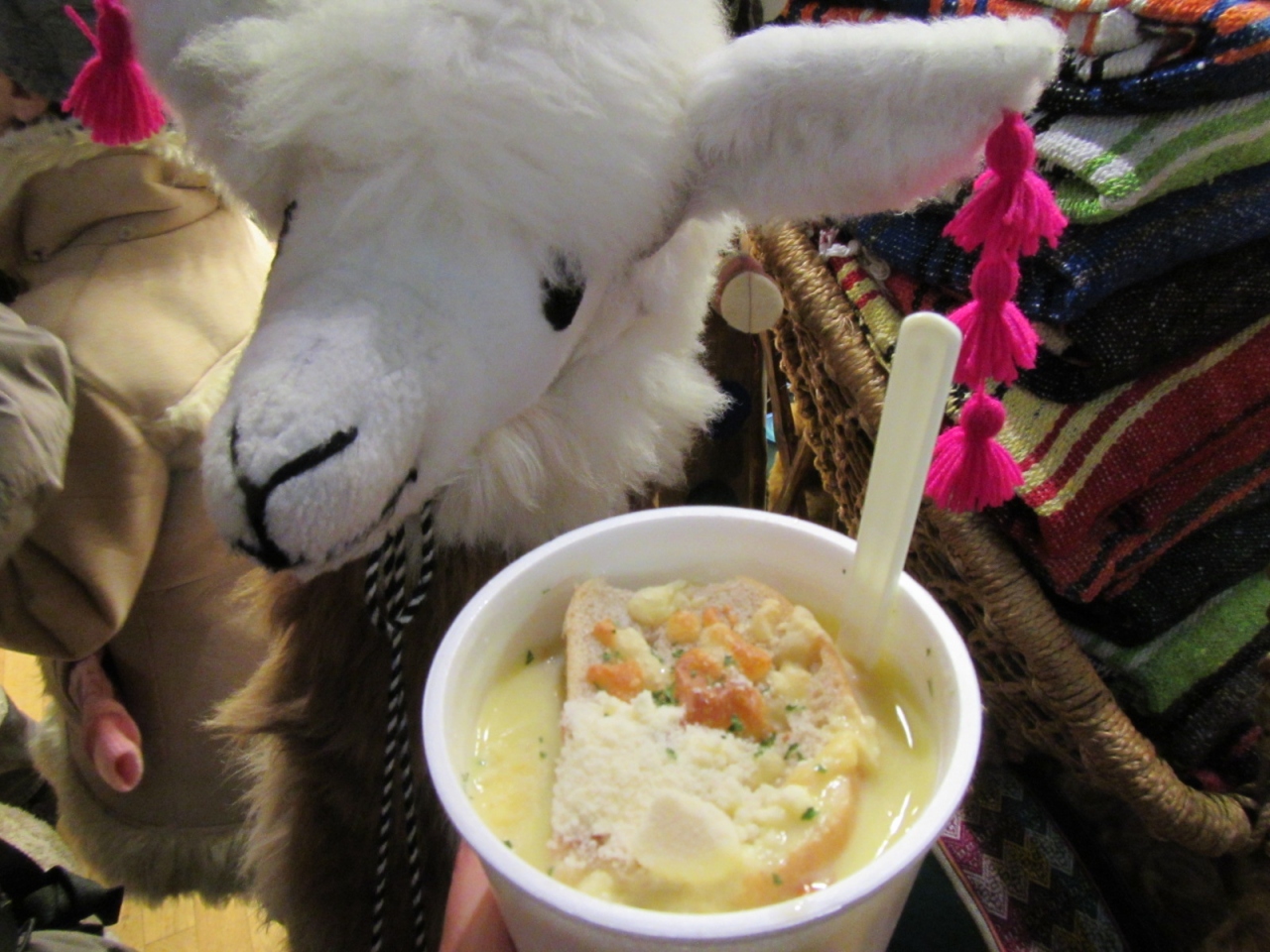 屋台のうちの一軒がチケット売り場になっていて、そこで一杯¥600円のチケットを購入、13種類あるスープ(クリスマスなのに13?・2015年)からお好きなもののある屋台へ行って注文します。