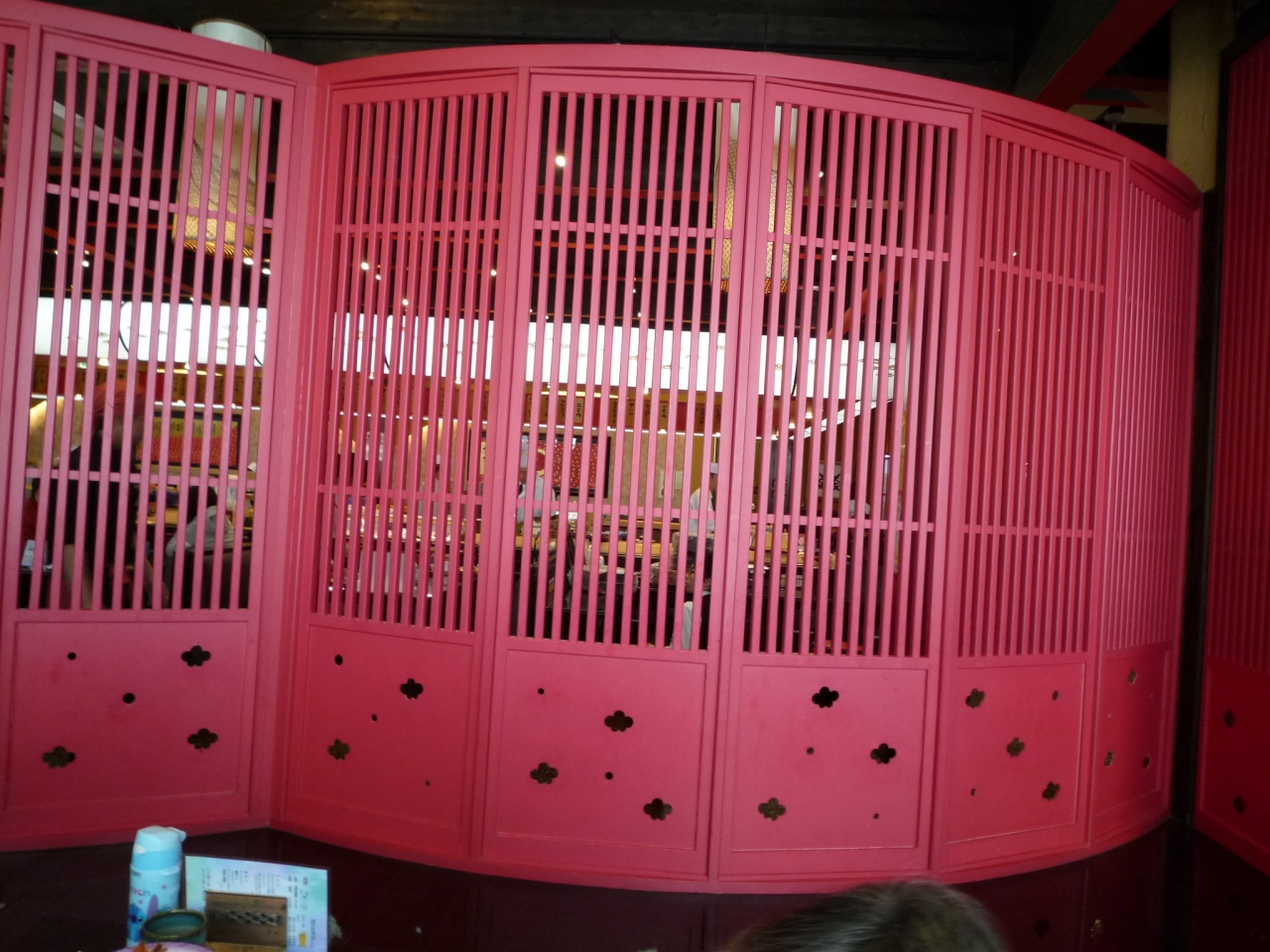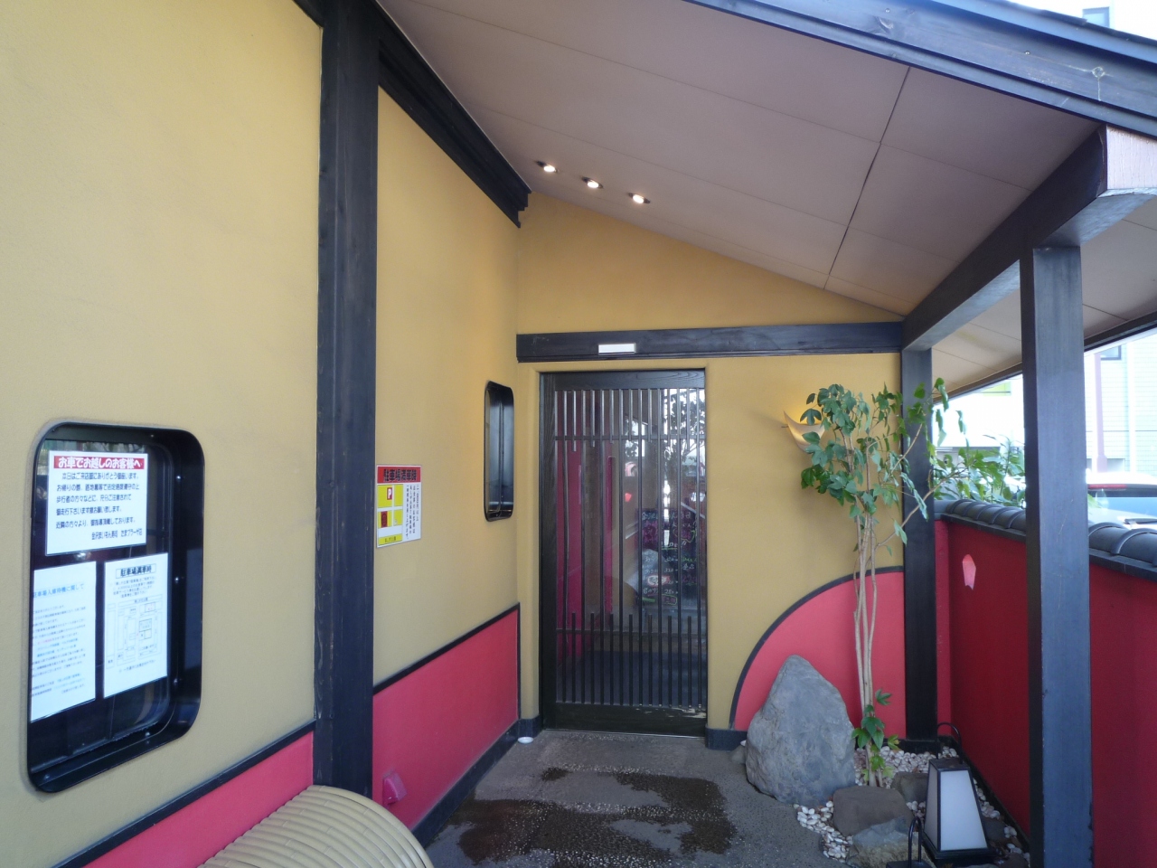 入口焚かれた篝火、広い駐車場、ライトアップされた日本式建物・・・幻想的な外観です。