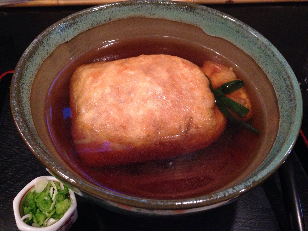 大きなおあげに中にはうどん、ねぎで口をしばって巾着様になっています。
