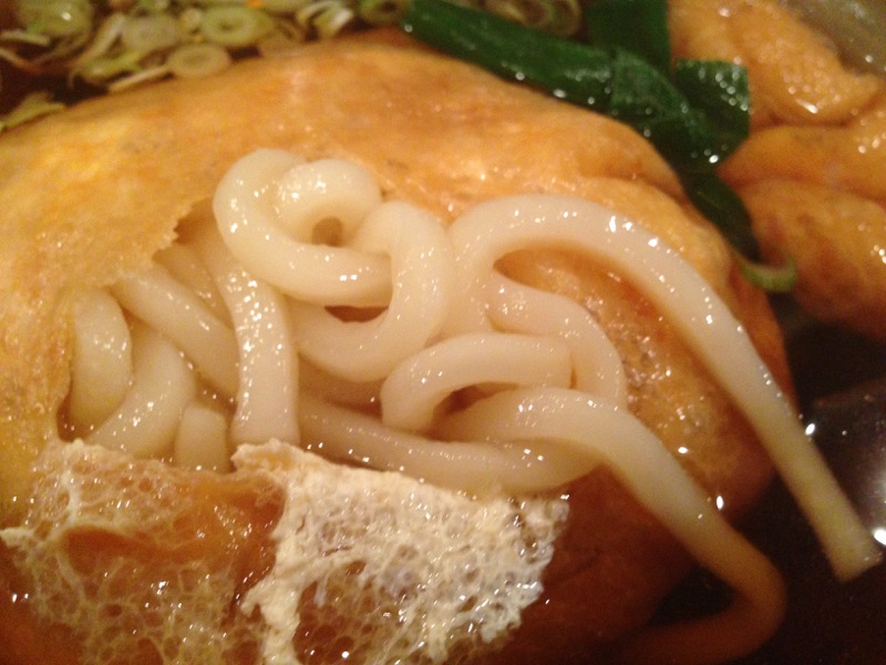 お揚げの巾着を破ると細めのうどんが入っていました。お揚げは甘さ控えめ。麺の量は結構ありますが、コシがあっておいしいうどん。