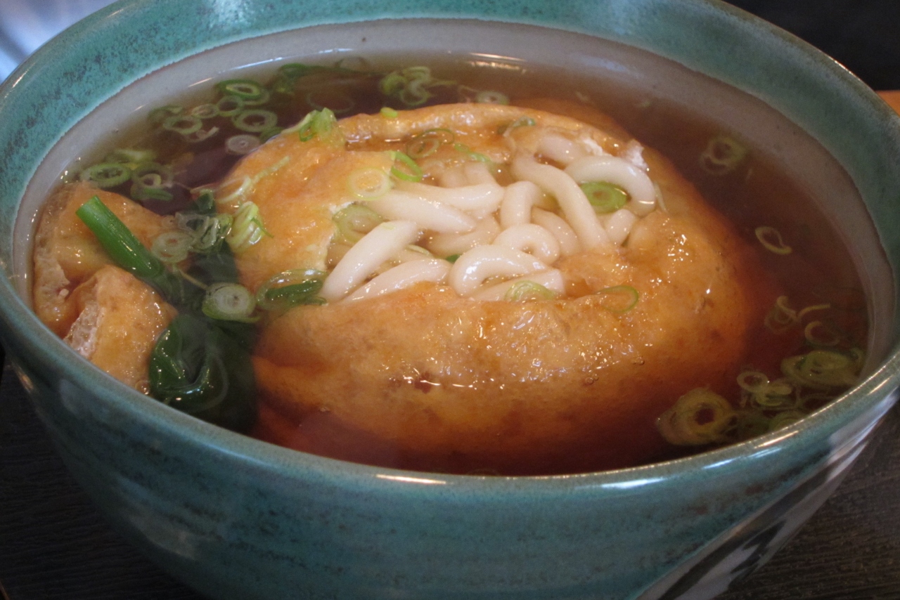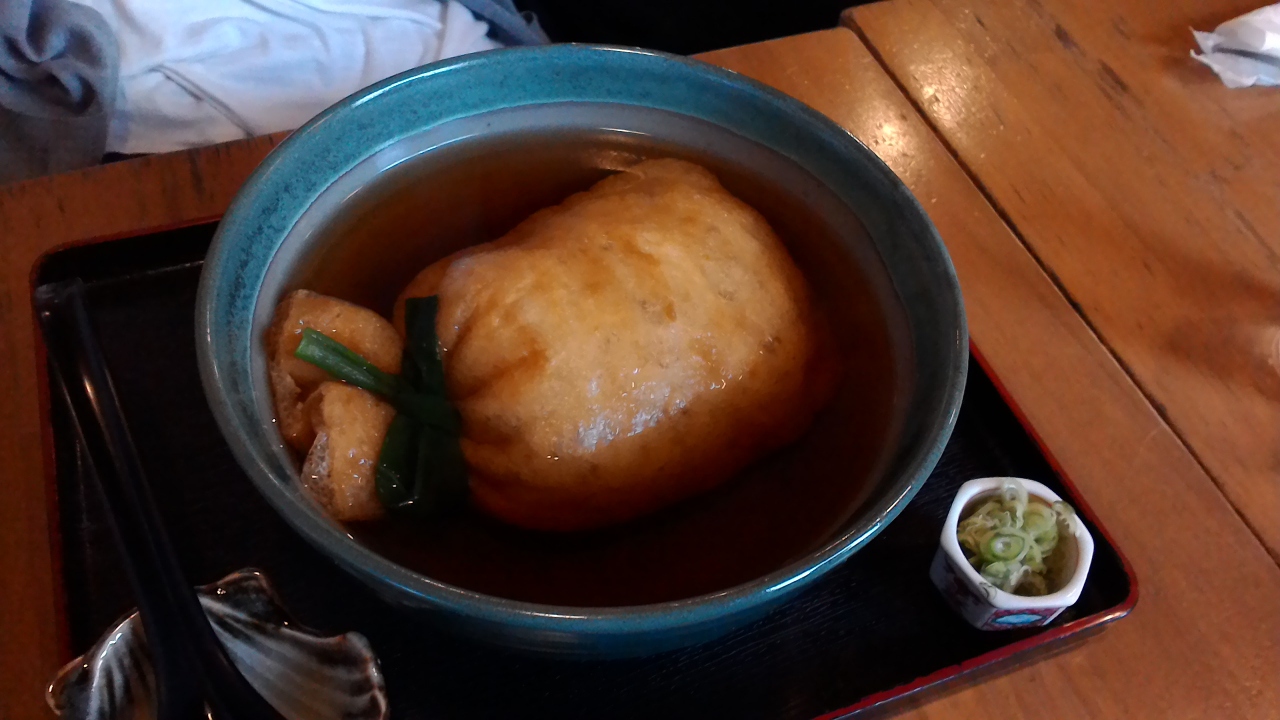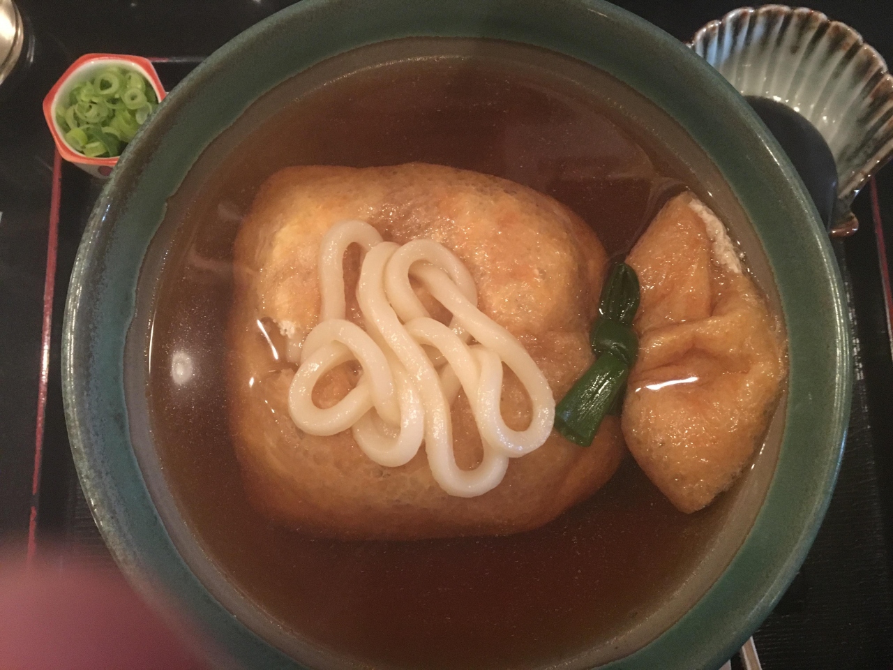有名な「巾着うどん」などを注文しました。巾着うどんは、上げの中にうどんが入っていて、ネギで口を結んであるうどんです。食べてしまえば普通のきつねうどんですが、珍しさもあって、他のお客さんも注文されている方が多かったです。