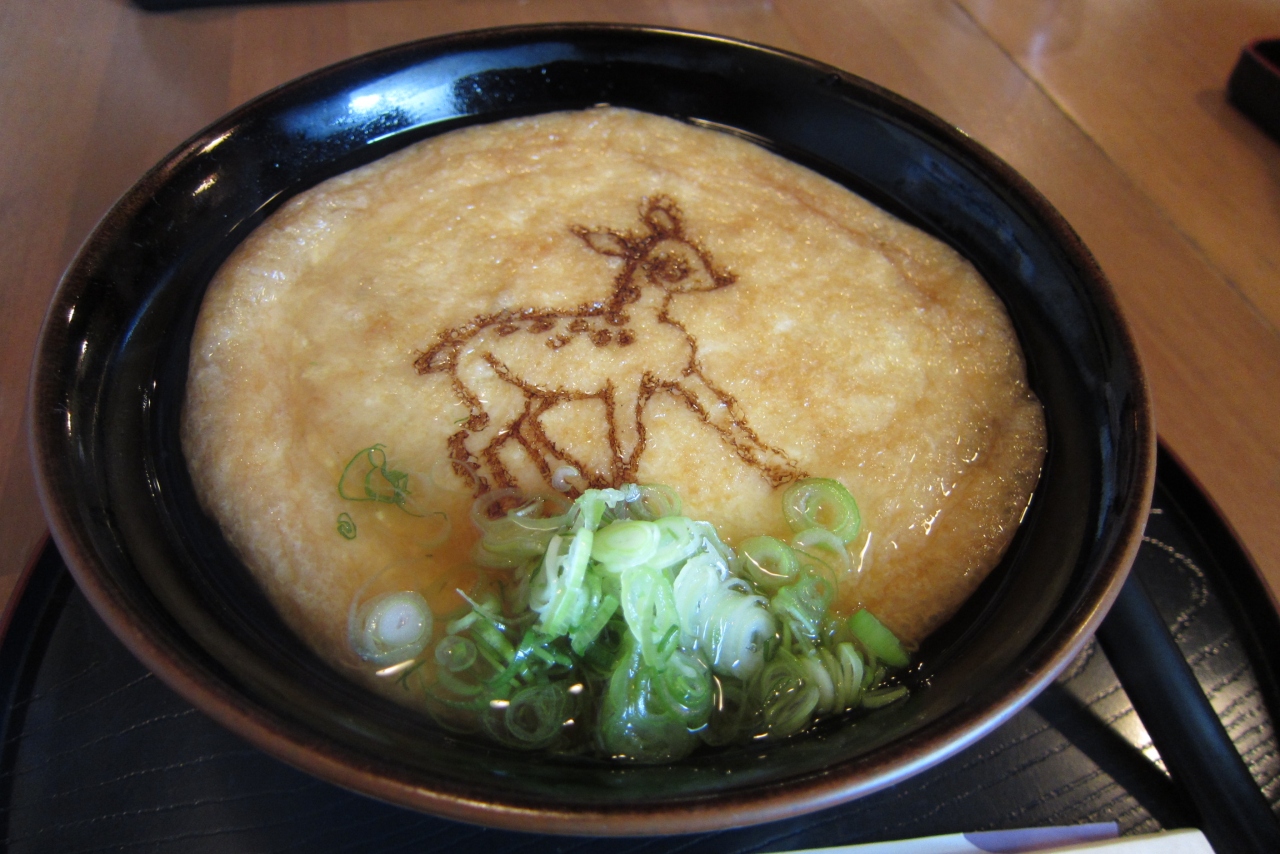 おあげは出汁がたっぷり染みています。甘さを求める場合は小鹿うどんがおすすめのようです。そのおあげを破るとなかからうどんが!!これよこれ♪とテンションが上がってしまいました。うどんはやわらかめです。付け合せのねぎがまたアクセントになります。