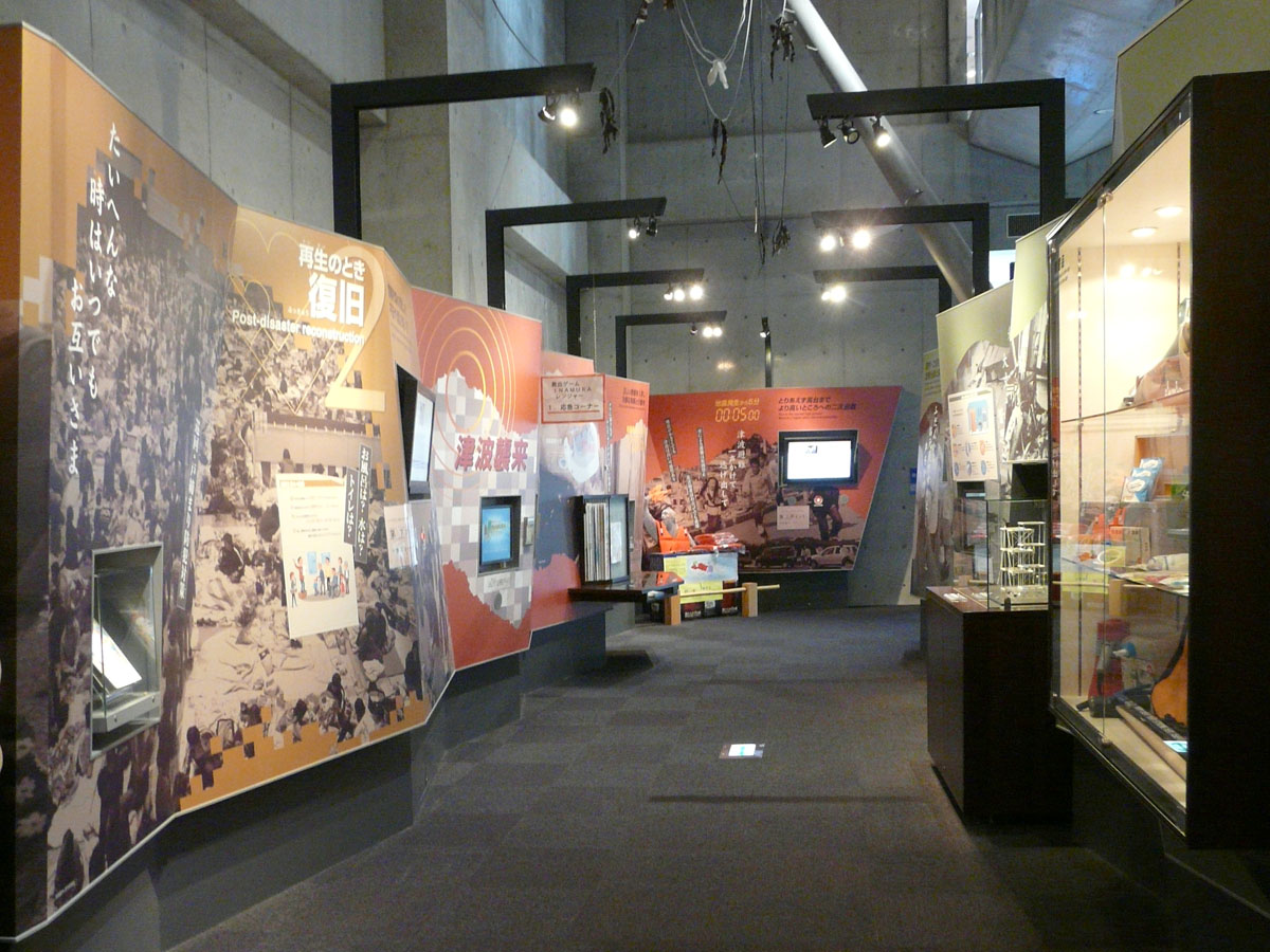 1階の防災体験室は「予防」、「応急」、「復旧」にテーマ分けして、救助用品や防災用品の展示、体験談の映像などを見て、津波や地震に対しての減災を知ることができます。展示数は多くないものの、自助・共助に重点が置かれた濃い内容に感じられました。子供向けに、ゲームやクイズで学べるディスプレイが用意されており、記念品が貰えます。
