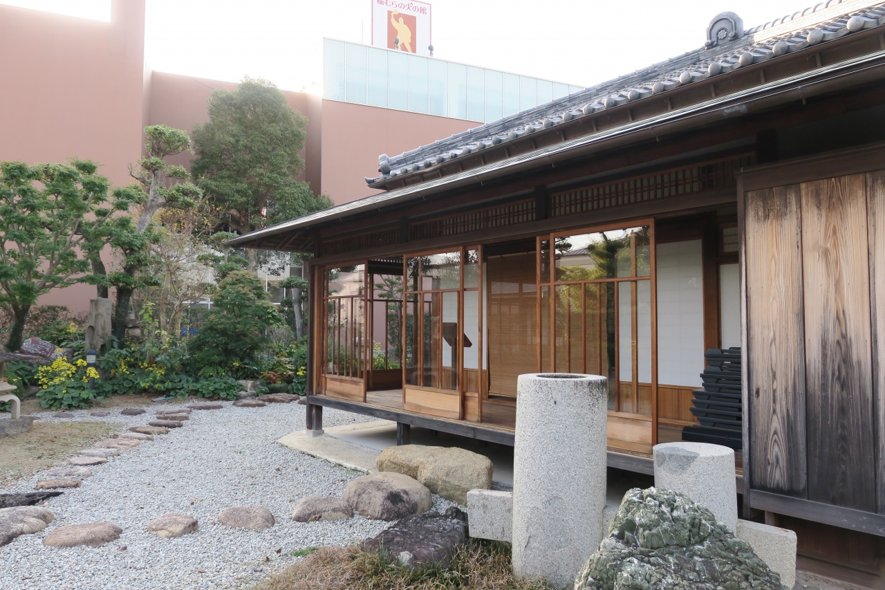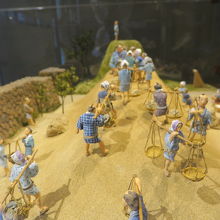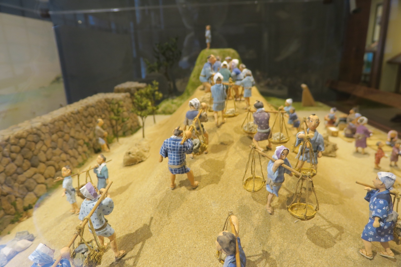 手前にある木造の建物が「濱口梧陵記念館」です。濱口梧陵は「稲むらの火」のもととなった人物で、ヤマサ醤油の七代目当主です。濱口家の家憲や梧陵の思想、勝海舟や福沢諭吉などとの交流がパネル展示、人形、映像で紹介されています。