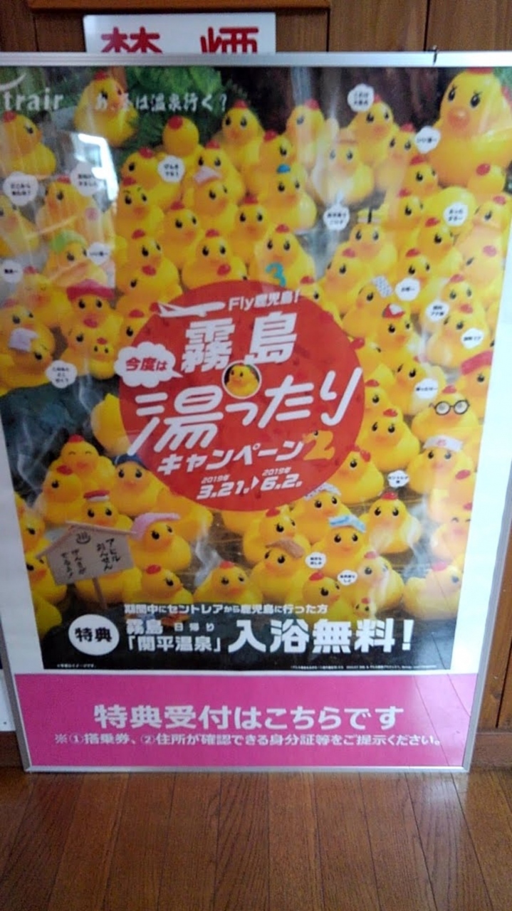 中部国際空港セントレアで『Fly 鹿児島!今度は霧島湯ったりキャンペーン』2019年3月21日から2019年6月2日という... 続きを読む素晴らしい内容のポスターを見つけてしまいました。期間中にセントレアから鹿児島に行った方霧島日帰り『関平温泉』入浴無料!さらに関平鉱泉水500ミリリットル1本プレゼント。セントレア→鹿児島の搭乗券半券と自分の居住地が分かる証明書が必要でした。私はスマフォのモバイルチケットですが、そちらでも恩恵に預かることができました。関平温泉は地元の人々に愛されている小ぢんまりとした温泉でした。洗い場も5つしかない小さな浴場でしたがお肌もすべすべになり疲れも取れました。 閉じる