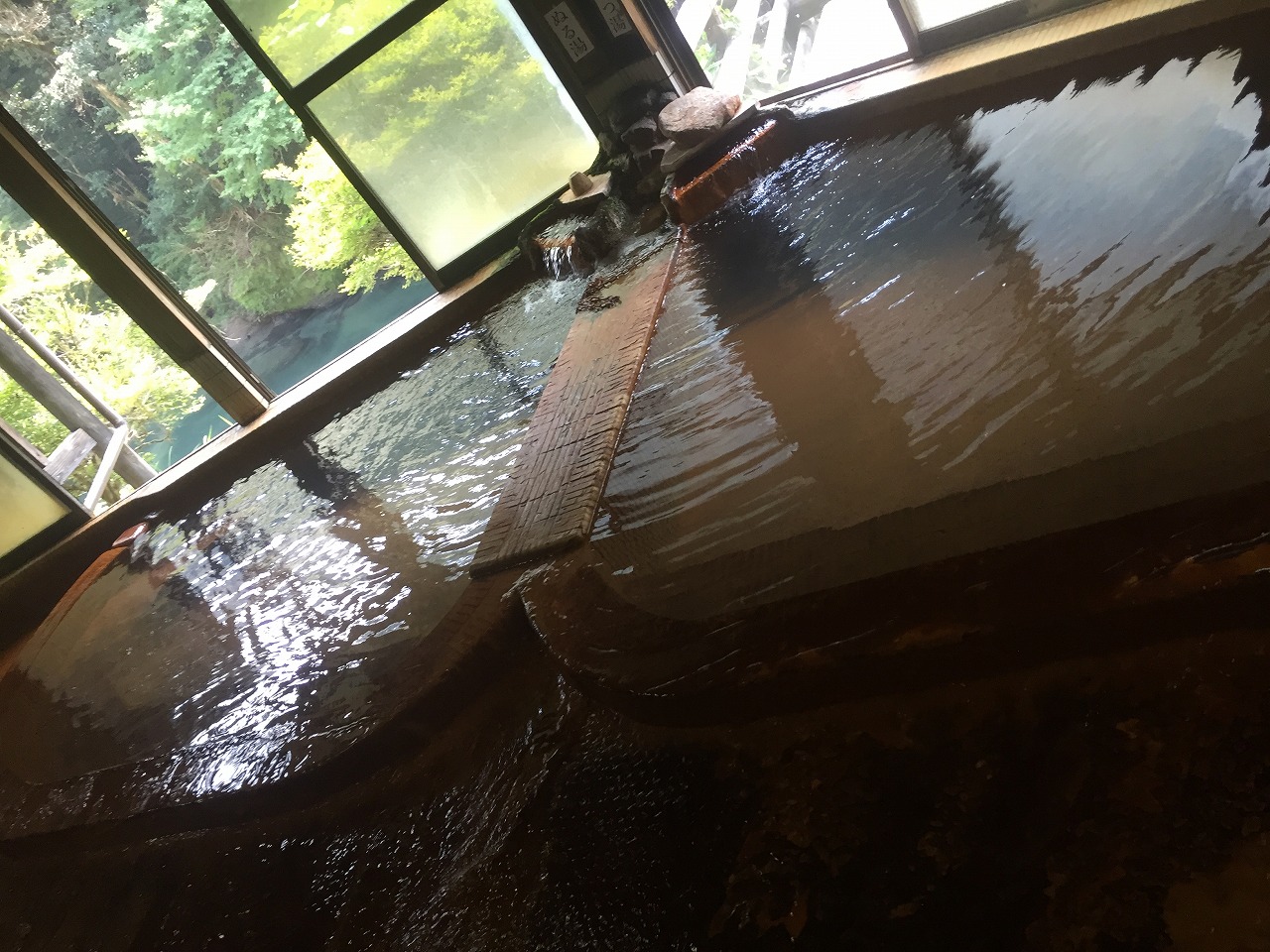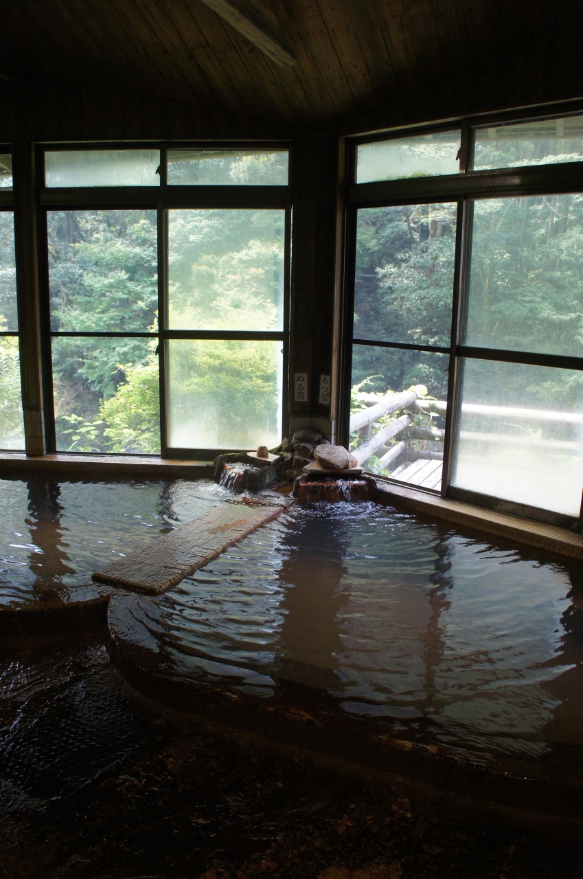 脱衣場は小さいですが、中は二つの湯舟があり、そこから天降川が見下ろせ、周辺の緑も深くとてもいい雰囲気です。