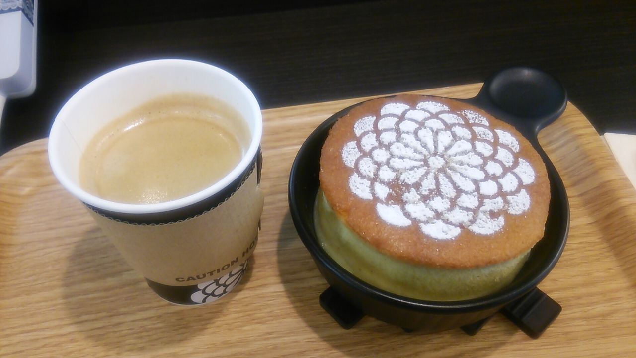 カフェでコーヒーとパンケーキ(たぶんチンしたやつ)