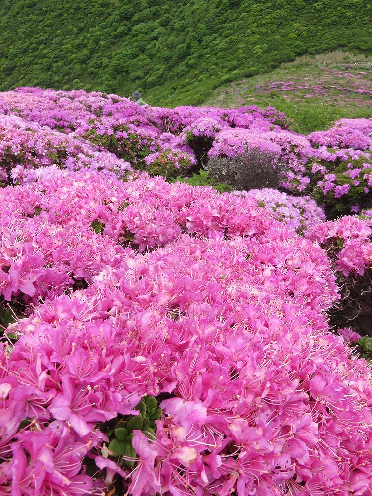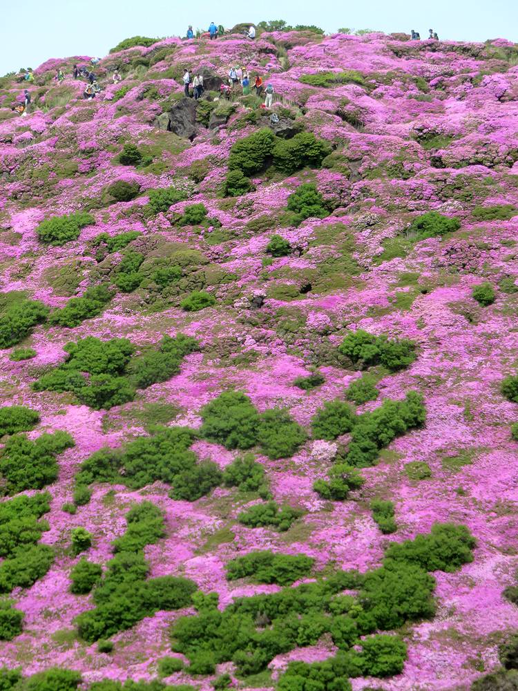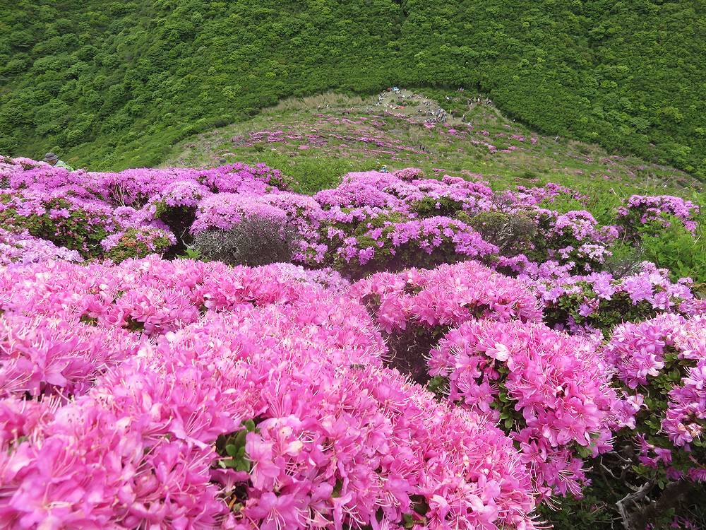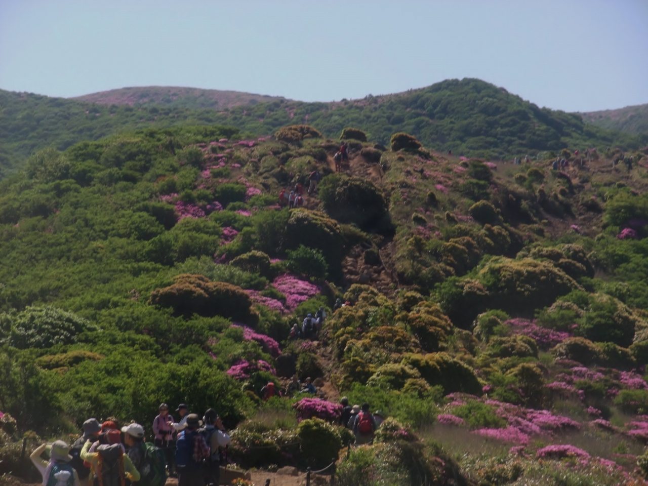 平治岳への道は渋滞緩和のため登り・下りが一方通行になっています。人で渋滞していましたが、ゆっくりゆっくり前進。南峰近くに来るとさすがに少し咲いていました。ここから本峰に行く手前が結構きれいに咲いていて、人が集まっていました。