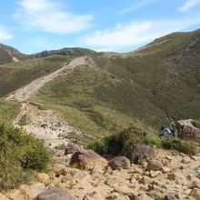 ここから北にそびえる平治岳に登っていくのですが。山が全然ピンクではありません。話によると今年はシャクトリムシの虫害で、ミヤマキリシマが全然咲いてないそうです。山の中腹から下は茶色にさえなっている感じ。