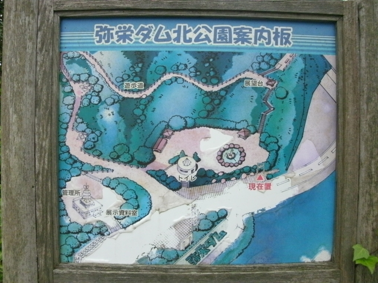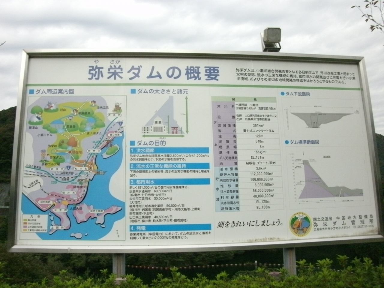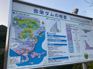 ダムサイト左岸に管理所があり、観光客が利用できる駐車場やトイレがあります。管理所の傍の“弥栄ダム展示資料室”では、ダムの役割や構造、ダム周辺の自然などについて模型やパネル展示があって興味深く拝見することができました。