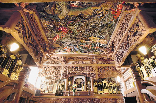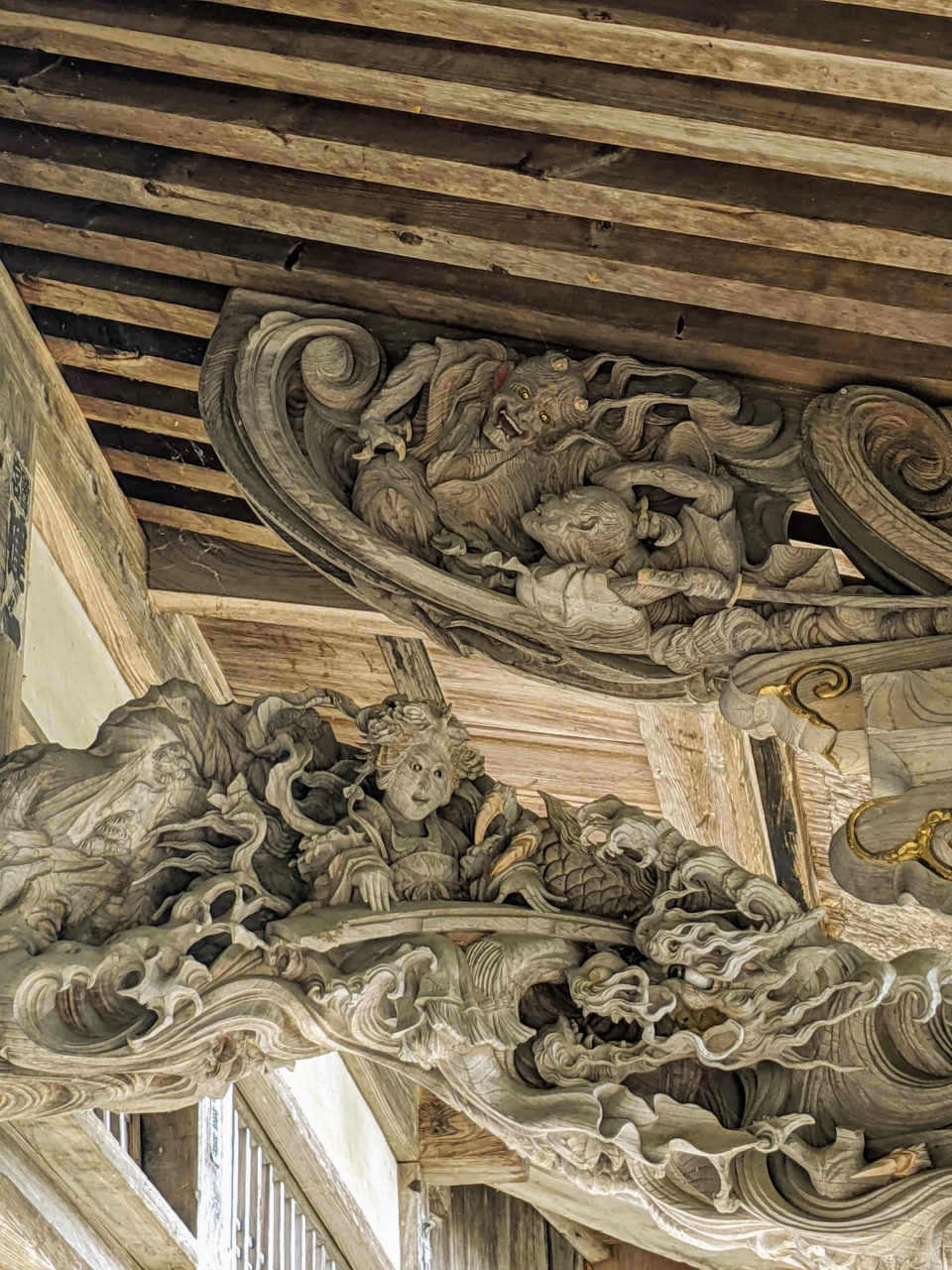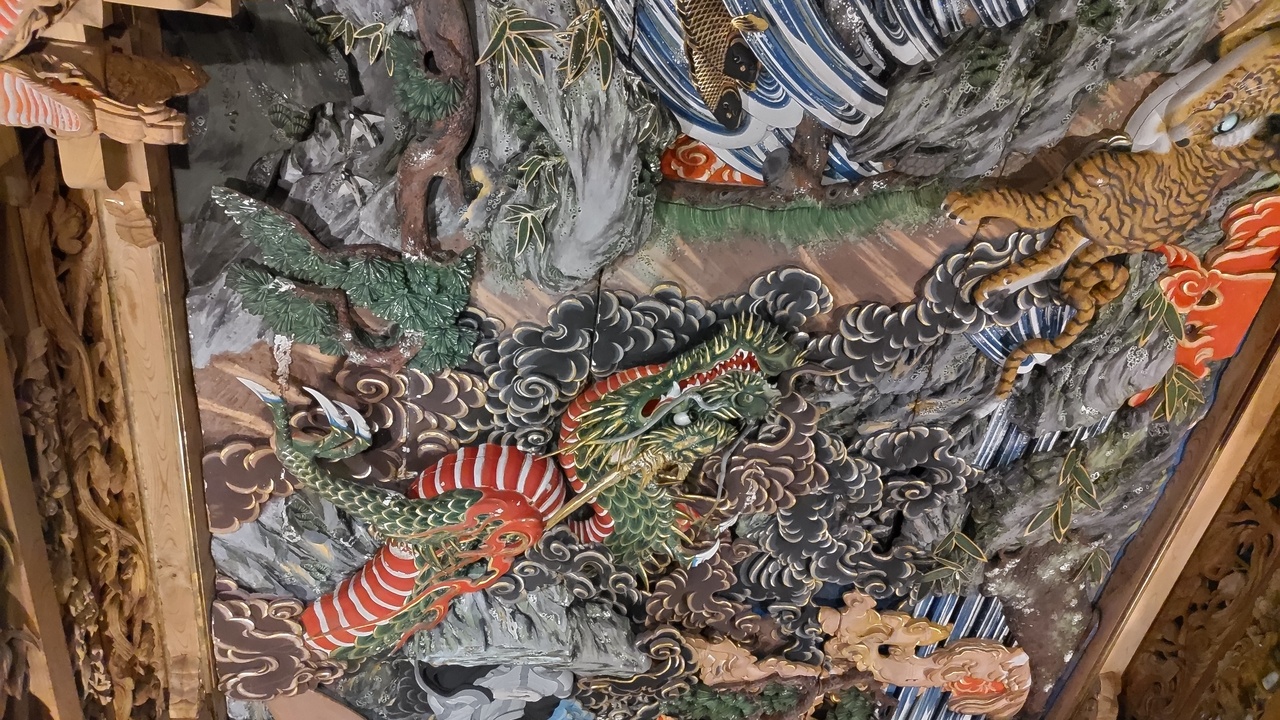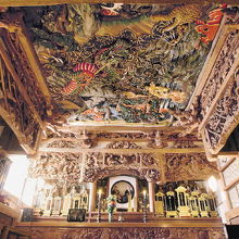 開祖道元禅師様を題材にした作品が多く、特に堂内の天井三間四方全面に施された大彫刻、「道元禅師猛虎調伏の図」は、透かし彫りの繊細さと極彩色のあざやかさで、観る人に感動を与えます。