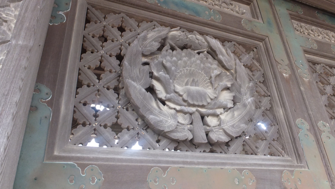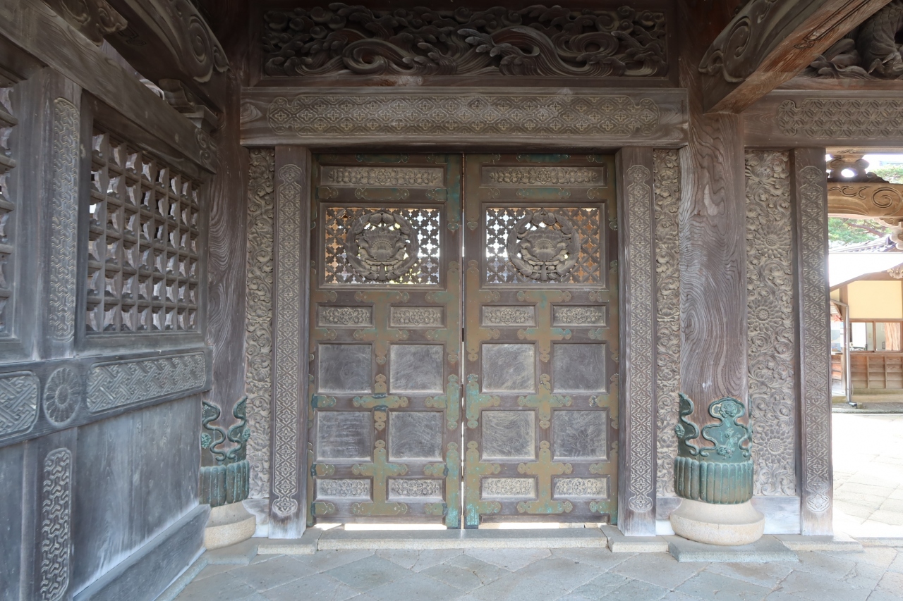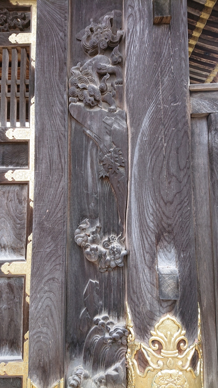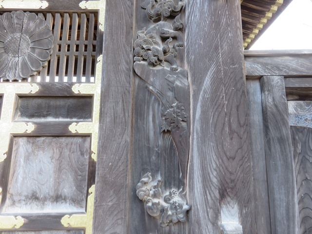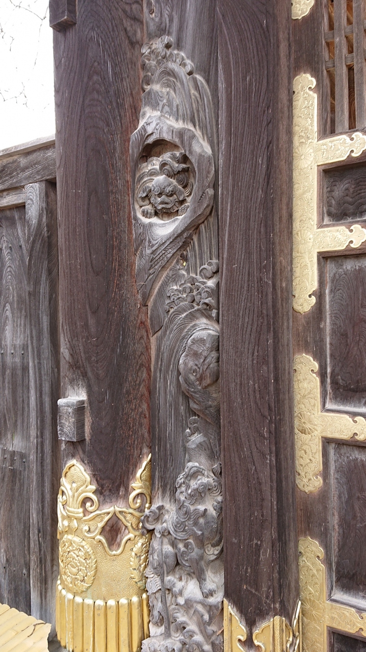 本堂、太子堂には素晴らしい欄間彫刻がありますが、山門脇の「勅使門」には、菊の門扉、両脇に彫刻した「獅子の子落とし」は井波彫刻の始祖「七左衛門」の代表作で、狩野派風な図柄で浮き彫りの技法が駆使され、日本彫刻史上の傑作とされています。