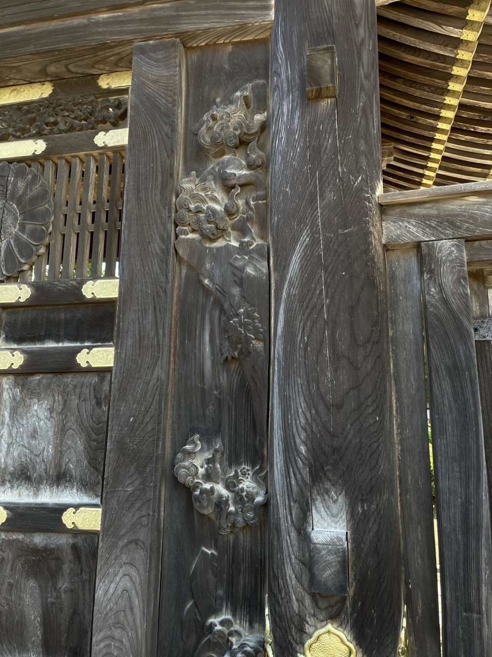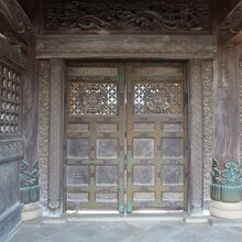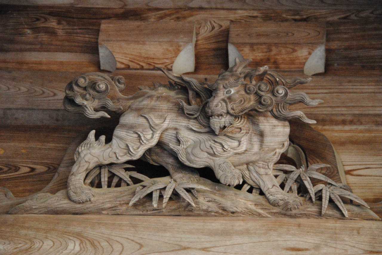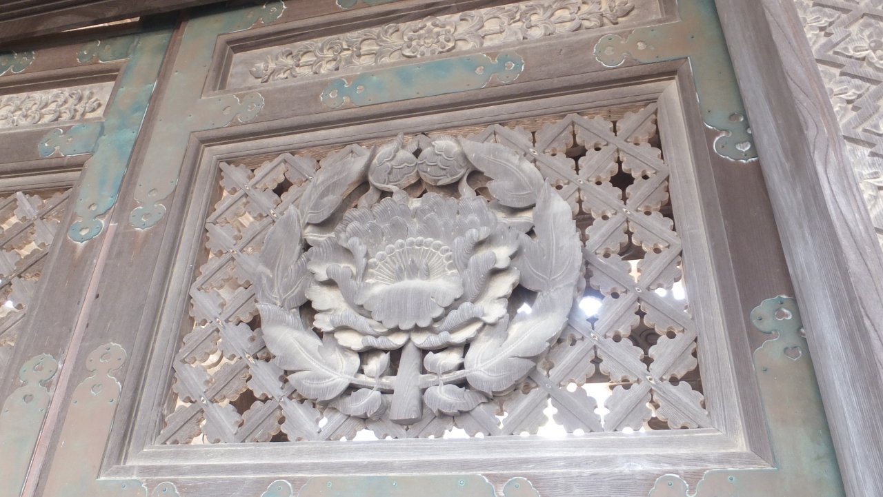 本堂、太子堂には素晴らしい欄間彫刻がありますが、山門脇の「勅使門」には、菊の門扉、両脇に彫刻した「獅子の子落とし」は井波彫刻の始祖「七左衛門」の代表作で、狩野派風な図柄で浮き彫りの技法が駆使され、日本彫刻史上の傑作とされています。