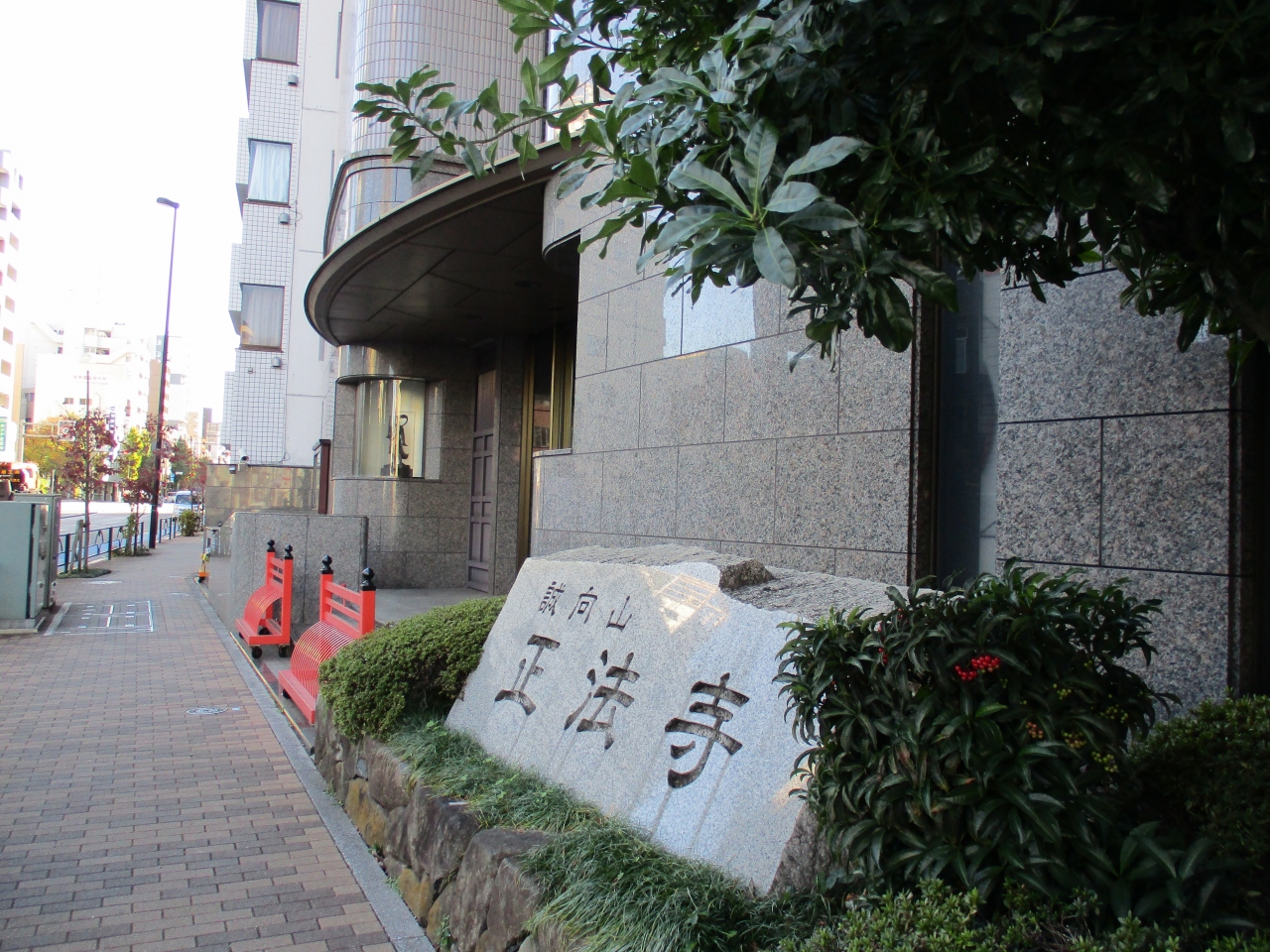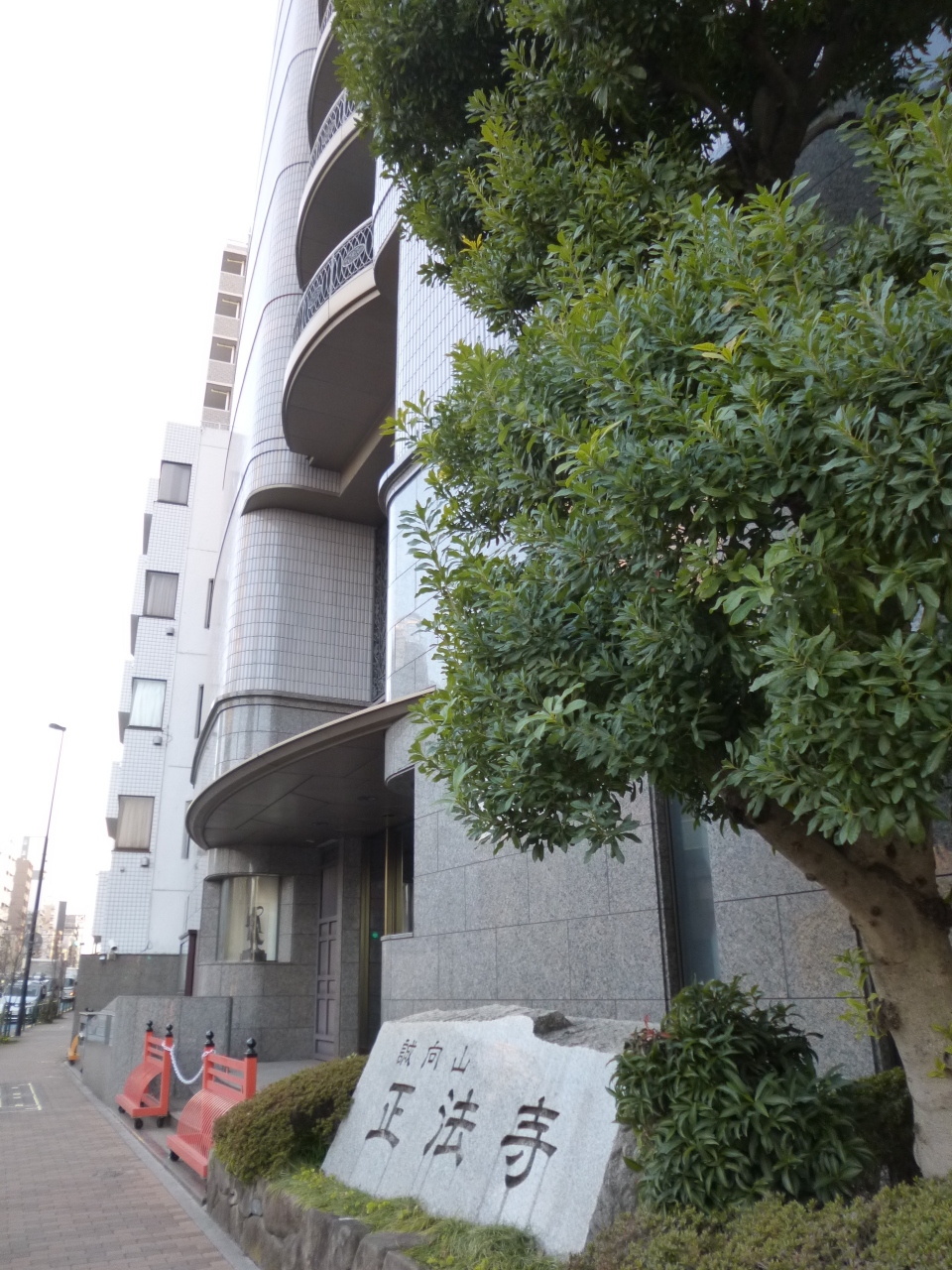 東浅草の吉野通沿いにあって、この道路沿いはマンションや事務所ビルが立ち並んでおり、同じように建っていますが、外観は普通の事... 続きを読む務所ビルの感じで、すぐ近くに来ても寺院であることは全く分からいです。唯一ここが寺院と認識できるのは、このビルの一階の植え込みのところに正法寺と刻まれた御影石のような石材の長方形の石標があって、初めて寺院であることを認識できます。この石標も企業名が刻まれていれば、会社のビルかな?という感じのもので、まったく寺院の雰囲気は有りません。このビルの中に本堂、会堂、墓所(屋内型)などが一通り備わった形であり、究極の都市型寺院の様相をていしています。 閉じる
