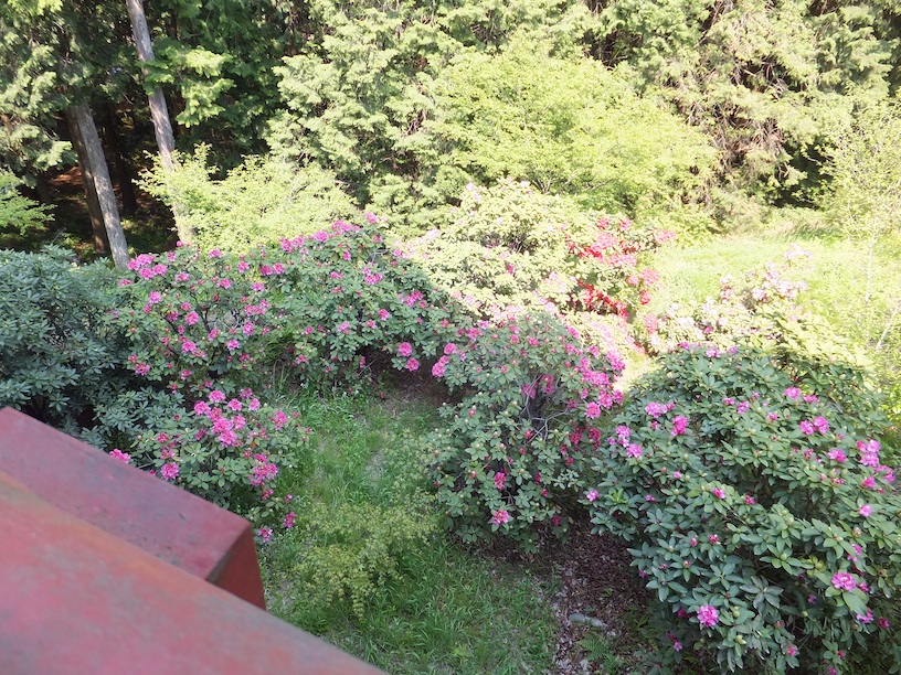 達磨像前の斜面にひろがるしゃくなげの庭園が花いっぱいになった図はさぞ、すばらしいと思います。