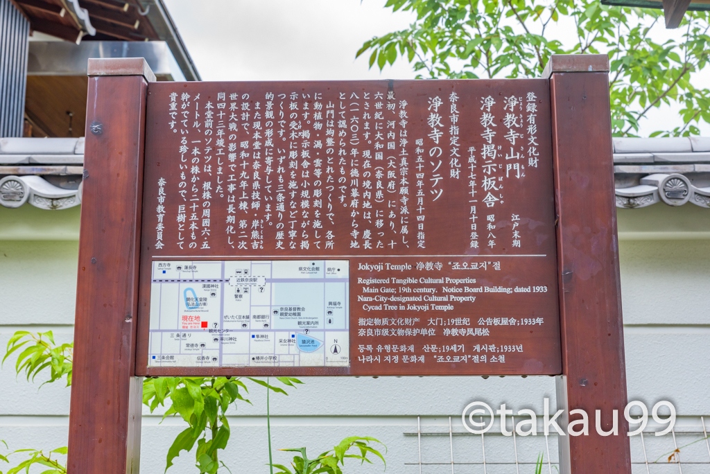 三条通りはJR奈良駅から近鉄奈良駅方向に延び春日大社へと至る通りで途中レストランやcafe、お土産屋さんなどが並ぶ商店街で... 続きを読むす。しかしお店やさんだけではありませんよ途中には「開化天皇陵」そしてその先にはこの「浄教寺」があります。浄教寺は、浄土真宗本願寺派の寺院で、親鸞聖人の弟子となった行延法師の開基になります。寛元2年(1244)に河内国で開創され慶長8年(1603)に現在地に移ってきたとのことです。境内にはいると本堂前にあるデッカイ「ソテツ」が目に付きます。樹齢300年以上で一本の株から25本もの幹が出ているそうで奈良県指定保護樹木に指定されています。また左には枝垂れ桜があり春には満開になるでしょう。見ごたえある寺院ですよ是非立ち寄ってくださいね。 閉じる