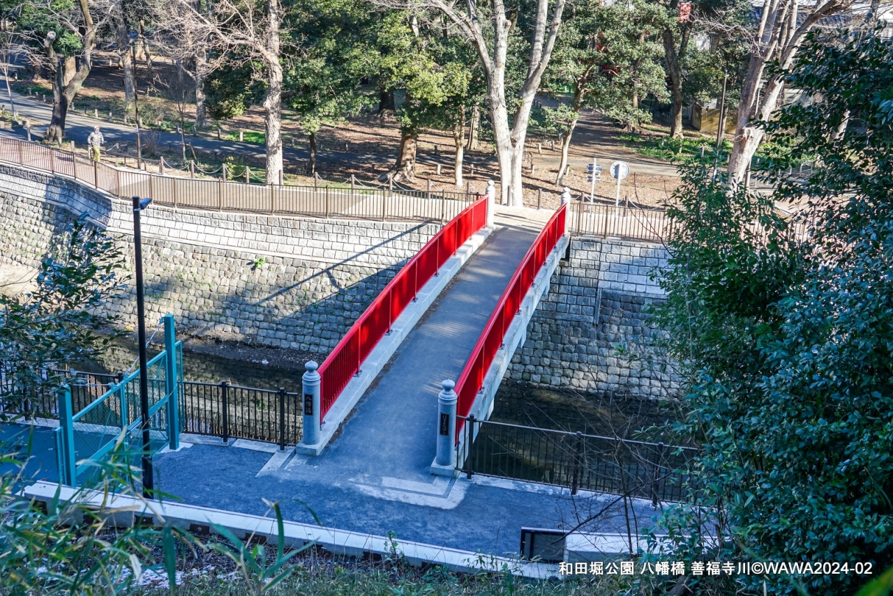 白山前橋から下流、済美橋まで12の橋にまたがる公園。池には大小の中島があり、都内では数少なくなった珍しい野鳥が棲む。隣接して大宮八幡宮がある。