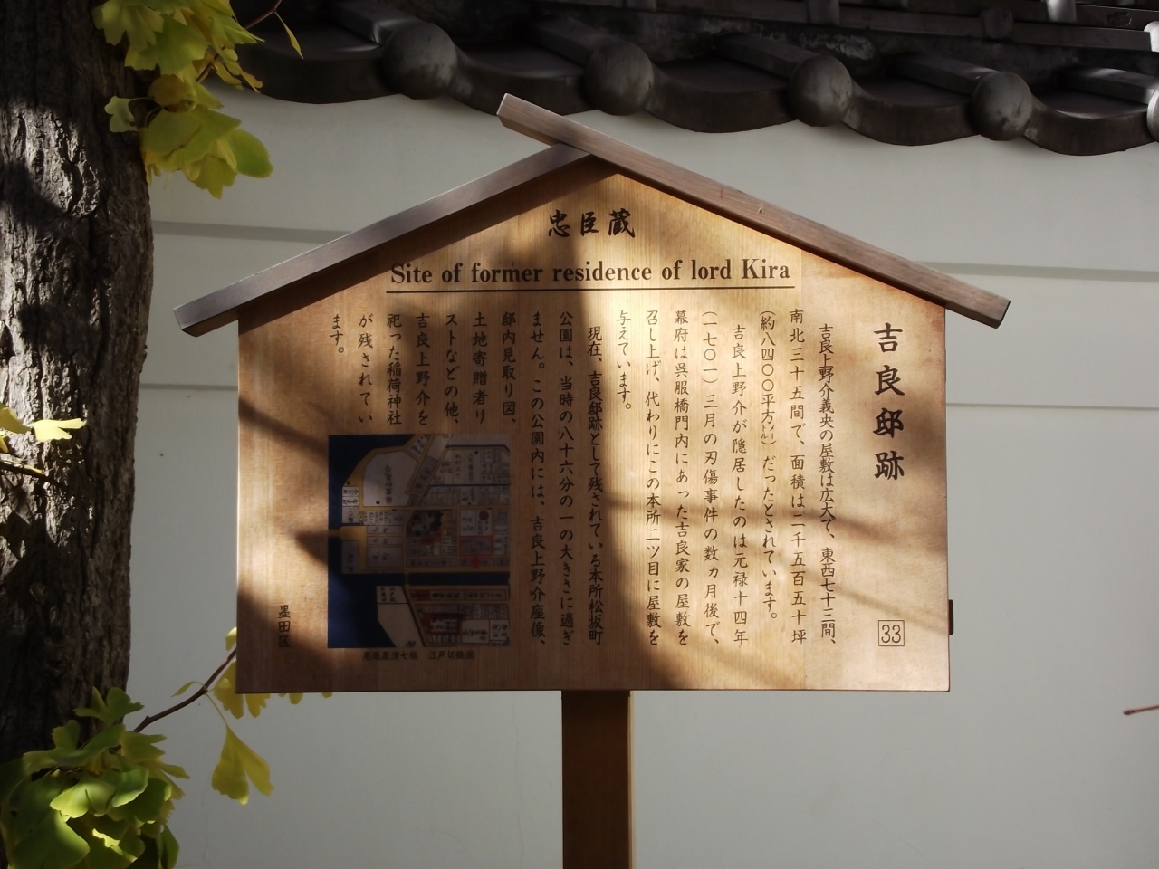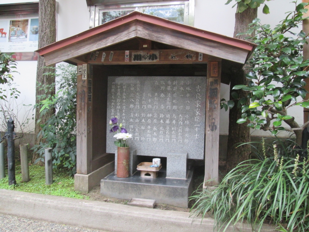 先月は泉岳寺に行ったので、今月は吉良邸跡に行って来ました。旧本所松坂町、現在は住宅やマンションが建て込んでいる中に吉良邸跡... 続きを読むはありました。泉岳寺が往時の雰囲気を残しているのに対して、この吉良邸跡は29.5坪、たった18畳ほどの面積しかなく、実際には広大であった吉良邸(東西132m、南北62m)の約86分の1という面積に過ぎません。それでも昭和9年に地元の有志の方々が「みしるし洗いの井戸」を中心に土地を購入し、東京市に寄付したことで貴重な旧跡が維持されたわけですから、感謝・感謝です。さて高家の格式を示すような“なまこ壁”に囲まれた吉良邸跡に入ると、まずは吉良公の首を洗ったとされる「みしるし洗いの井戸」が目に入ります。その左手には討ち入りの際に命を絶たれた吉良家の家臣20名を祀る「吉良家家臣二十士碑」、そして「吉良上野介追慕碑」があり、井戸の右手には愛知県吉良町の吉良家菩提寺に現存する像そっくりに造られた「吉良上野介義央公像」があります。また“なまこ壁”の内側には、事件の顛末をあらわした絵や文章のパネルが展示されていました。地元では名君として有名な吉良公、やはり吉良家の菩提寺や吉良公のお墓を訪ねて見たいという気持ちになりました。 閉じる