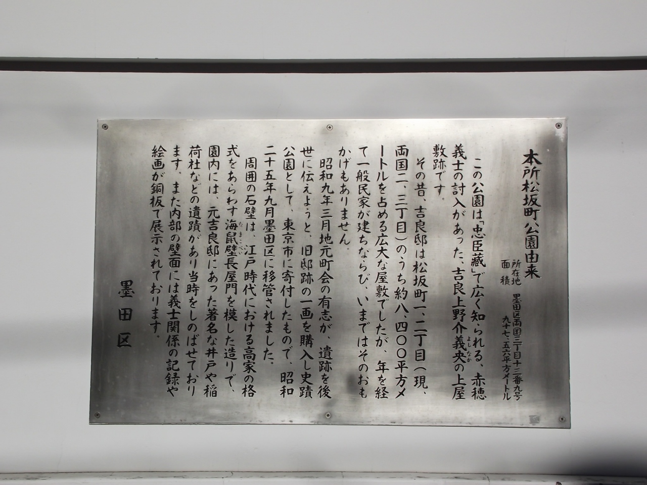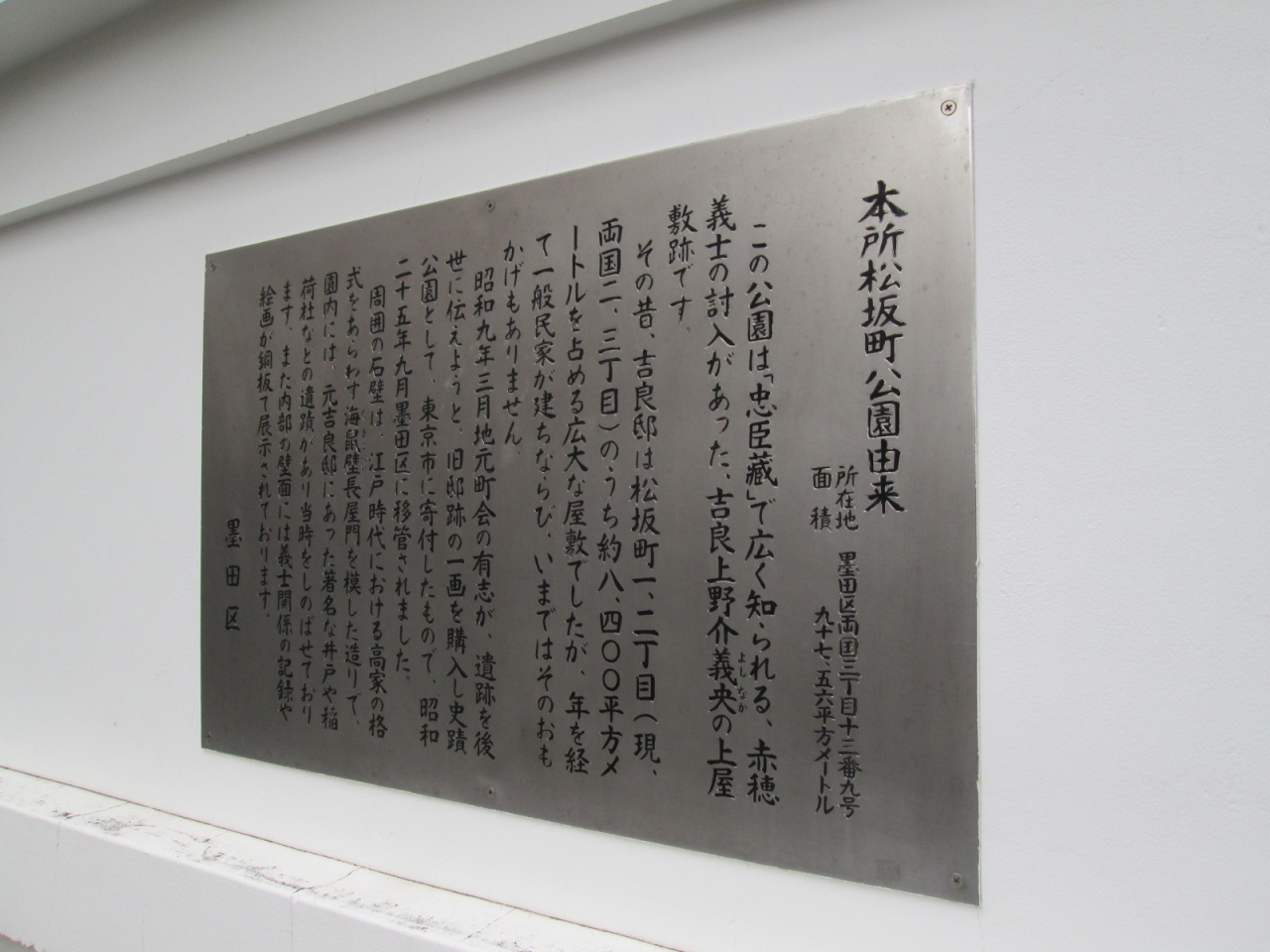 吉良邸跡は赤穂浪士47人が討ち入った舞台で、現在は「本所松坂町公園」となっています。