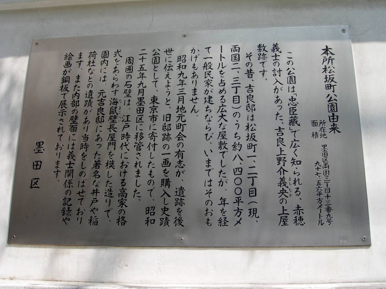 「吉良邸跡」は、墨田区両国3丁目の「本所松坂町公園」にあります。「吉良邸跡」へのアクセスは、JR総武本線「両国駅」の東口を... 続きを読む出て左方向に進みます。70mほど直進すると横断歩道があるのでそれを渡り道路の反対側に行きます。左方向に90mほど直進すると「国道14号」(京葉道路)があり、右手すぐに横断歩道がありますので、それを渡り道なりに110mほど進みます。3つ目の角がありますので、その角を右折し、50mほど進むと右手に「本所松坂町公園」があり「吉良邸跡」はその中にあります 「吉良邸跡」は、「忠臣蔵」で知られる「吉良上野介義央」の江戸上屋敷跡です。かつて「吉良上野介」はこの一帯に、東西に「733間」(約134m)、「南北」に34間(約63m)、坪数2,550坪(約8,400㎡)もある広大な屋敷を構えていたそうです。現在の「本所松坂町公園」の面積は、97.56㎡なので、86分の1の規模しかありません。それを考えるといかに広大であったか想像できます。「吉良上野介」が「近藤登之介」の屋敷跡を拝領したのが元禄14年(1701年)9月3日、義士の討入りがあって没収されたのが同16年(1703年)2月4日ですから、実際に住んだのは1年半に満たない短期間でした。「吉良邸」は、最初は「鍛冶橋」にありましたが、元禄11年(1698年)の「元禄の大火」で焼失し、その後呉服橋で再建しました。そして、江戸城「松の廊下」での殺傷事件の後で、呉服橋の吉良邸を召し上げられて、江戸郊外の「本所松坂町」に移っていたのです。「吉良邸跡」の往時を偲ぶ高家を表す海鼠壁長屋門を模した塀と門に囲まれ、「吉良上野介」の首を洗ったとされる「首洗いの井戸」や「供養碑」が残されています。また、公園内にある「松坂稲荷大明神」は、江戸時代はじめに「御竹蔵」の水門内に鎮座した「兼春稲荷」で、討ち入り以後に「吉良邸跡」へ地所清めのために遷座したものだそうです。「本所松坂町公園」、は昭和9年(1935年)に、当地で赤穂義士による仇討ち事件が起こり、その名所を惜しんだ地元の両国三丁目町会有志が発起人となって、邸内の「吉良の首洗いの井戸」を中心に土地を購入し、同昭和9年(1935年)3月に、京都に寄付しました。当時ここは「本所松坂町」と呼ばれていたので、現在は「本所松坂町公園」という名称になっています。 01_【吉良邸跡(本所松坂町公園)の一口メモ】 所在地…〒130-0026 東京都墨田区両国3丁目13-9 本所松坂町公園 02_【吉良邸跡(本所松坂町公園)へのアクセス】 1 電車を利用して ⑴ JR総武本線「両国駅」東口から徒歩6分400m ⑵ 都営地下鉄大江戸線「両国駅」A5番出口から徒歩7分500m 閉じる