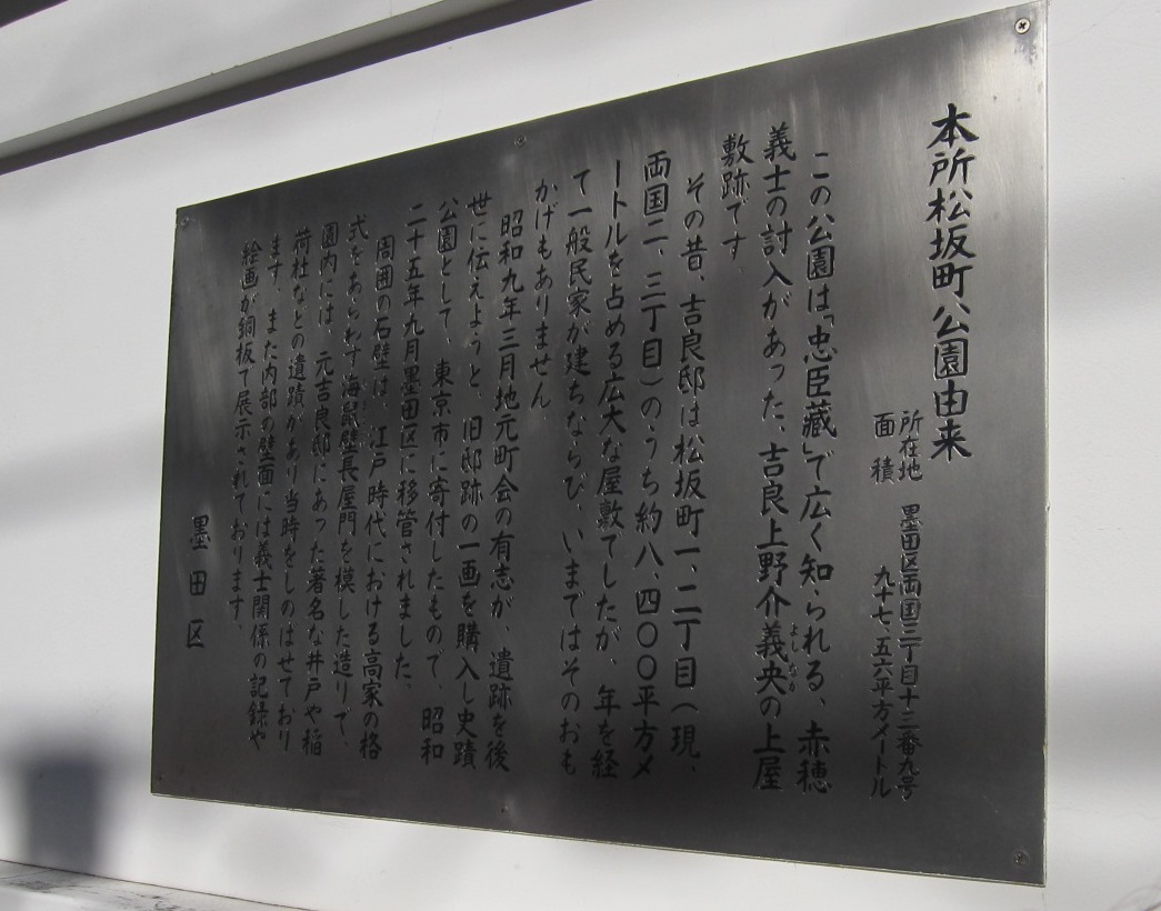 吉良上野介義央の上屋敷跡の一部を、地元町内会の有志が購入し史跡公園として東京市に寄付したものです。
