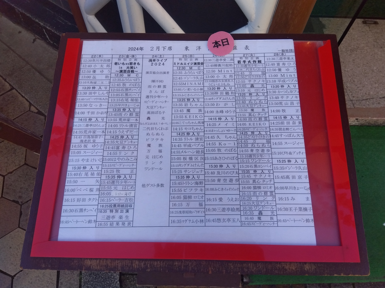 「浅草演芸ホール」ほど寒くなかったが、設備の古さはほぼ同じ。座席は狭くて傾斜もあまりありません。トイレは和式ばかりでした。