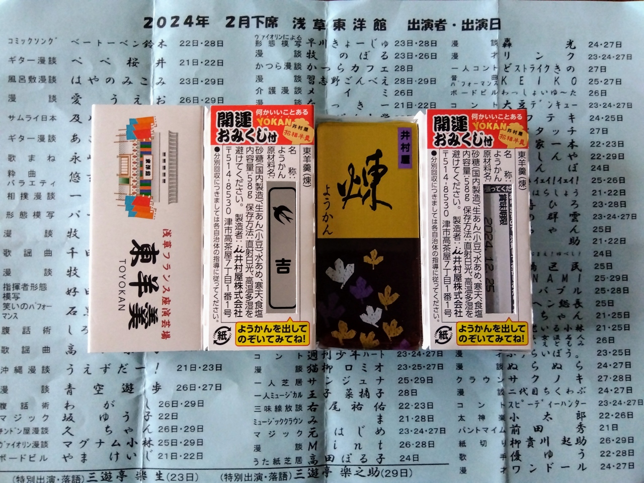 東洋館オリジナル「東羊羹」はおみくじ付の羊羹で、大吉が出ると、東洋館の招待券がもらえます。3個購入、吉、半吉、末吉でした。