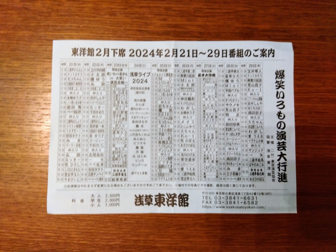 12時半開演から17時終演まで、漫才、漫談、コント、マジック、紙切り、... 続きを読む曲芸、ものまねなど21演目を観覧。仲入り(10分程度の休憩のようなもの)が3回。チケットは2,500円(再入場不可)。思いのほか楽しめ、結構笑えました。