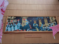ロビーには能登の祭りを描いた壁画や輪島沈金の屏風があり