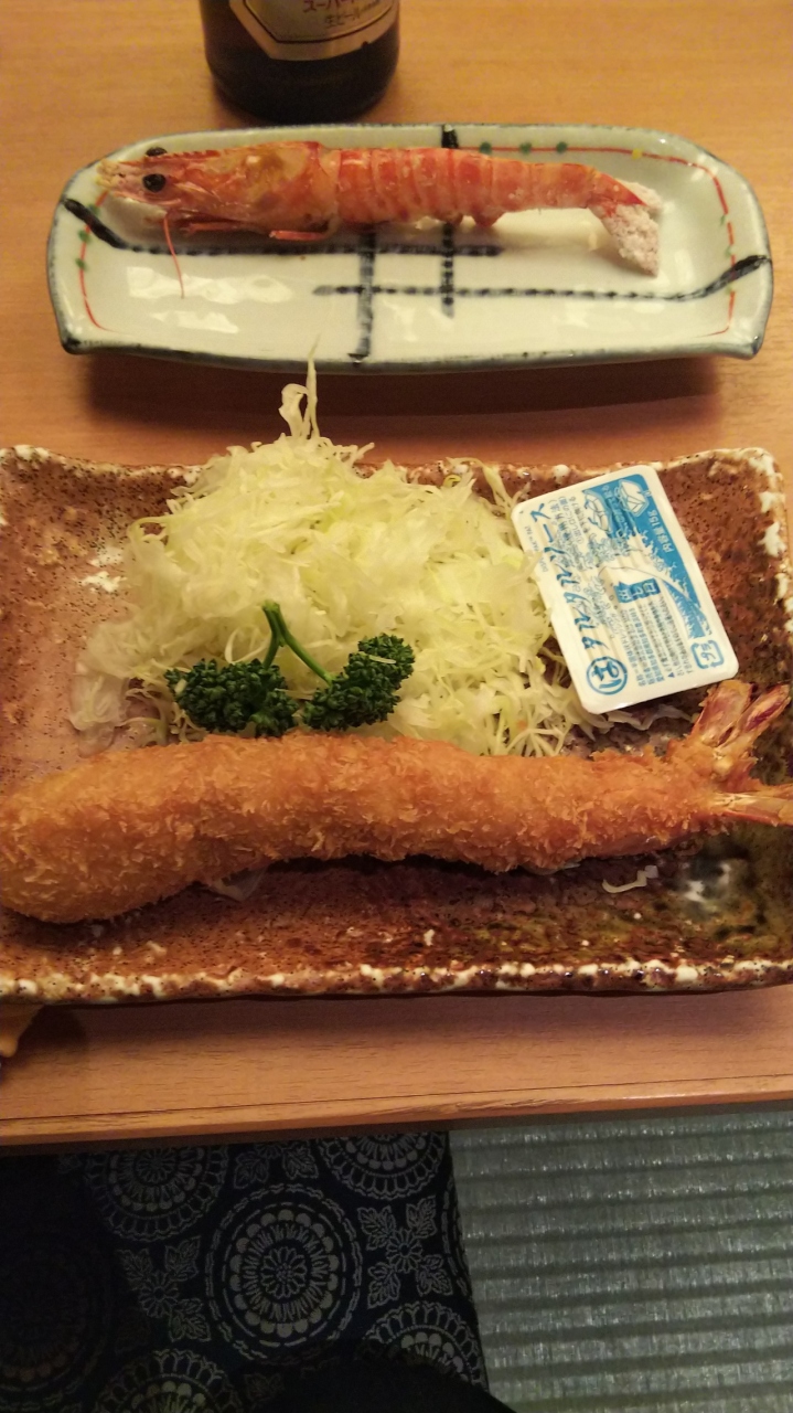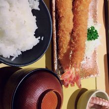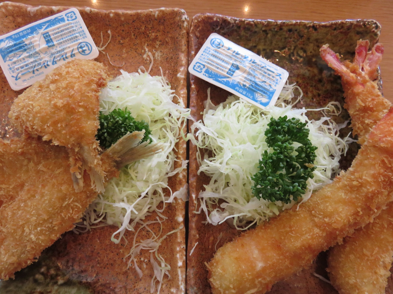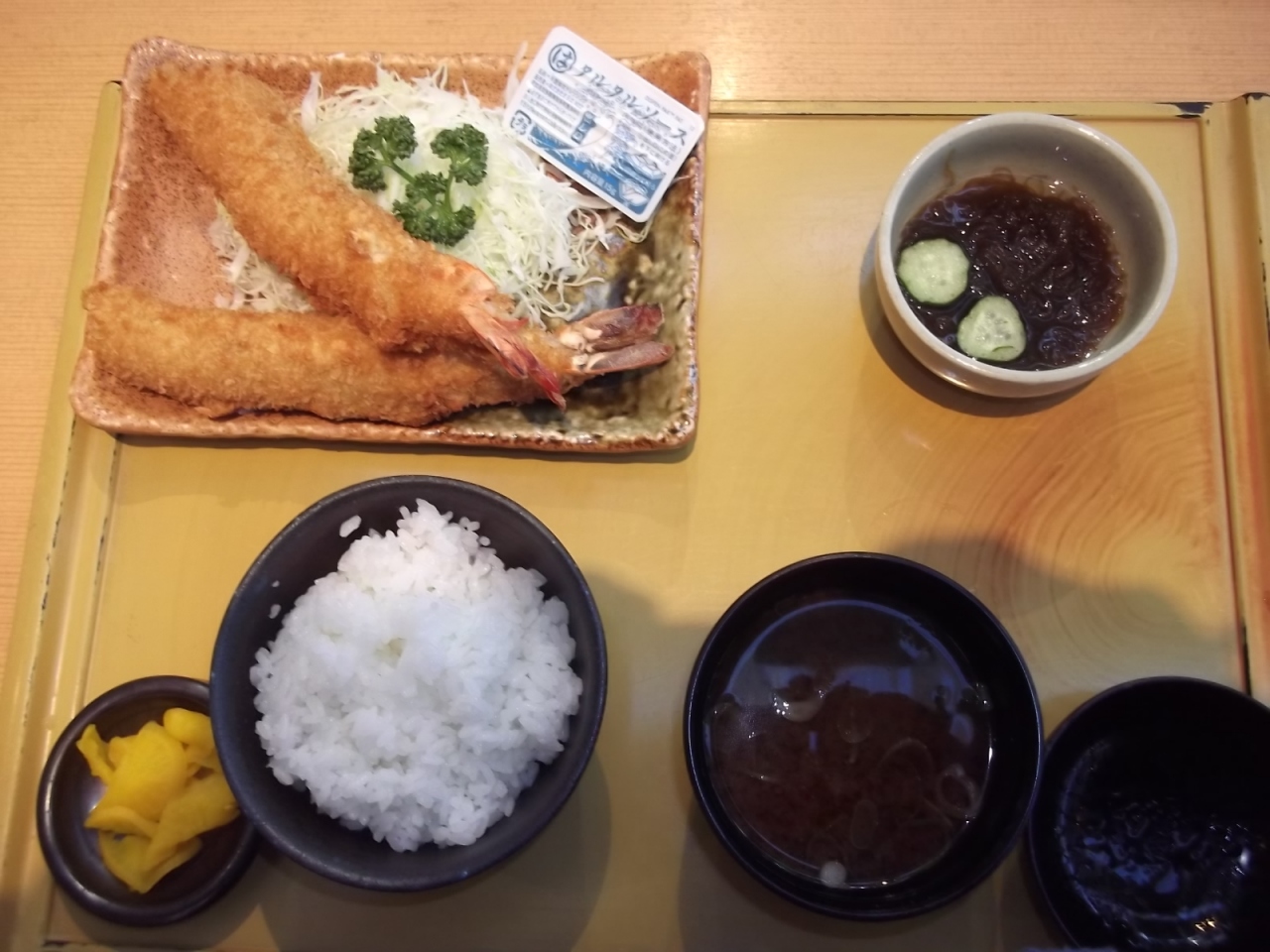 エビフライが食べたい私はエビフライが2つのった定食を、妻はお刺身定食を注文。確かにエビは、何も知らずに注文したら、出てきてびっくりのサイズでした。美味しかったです。