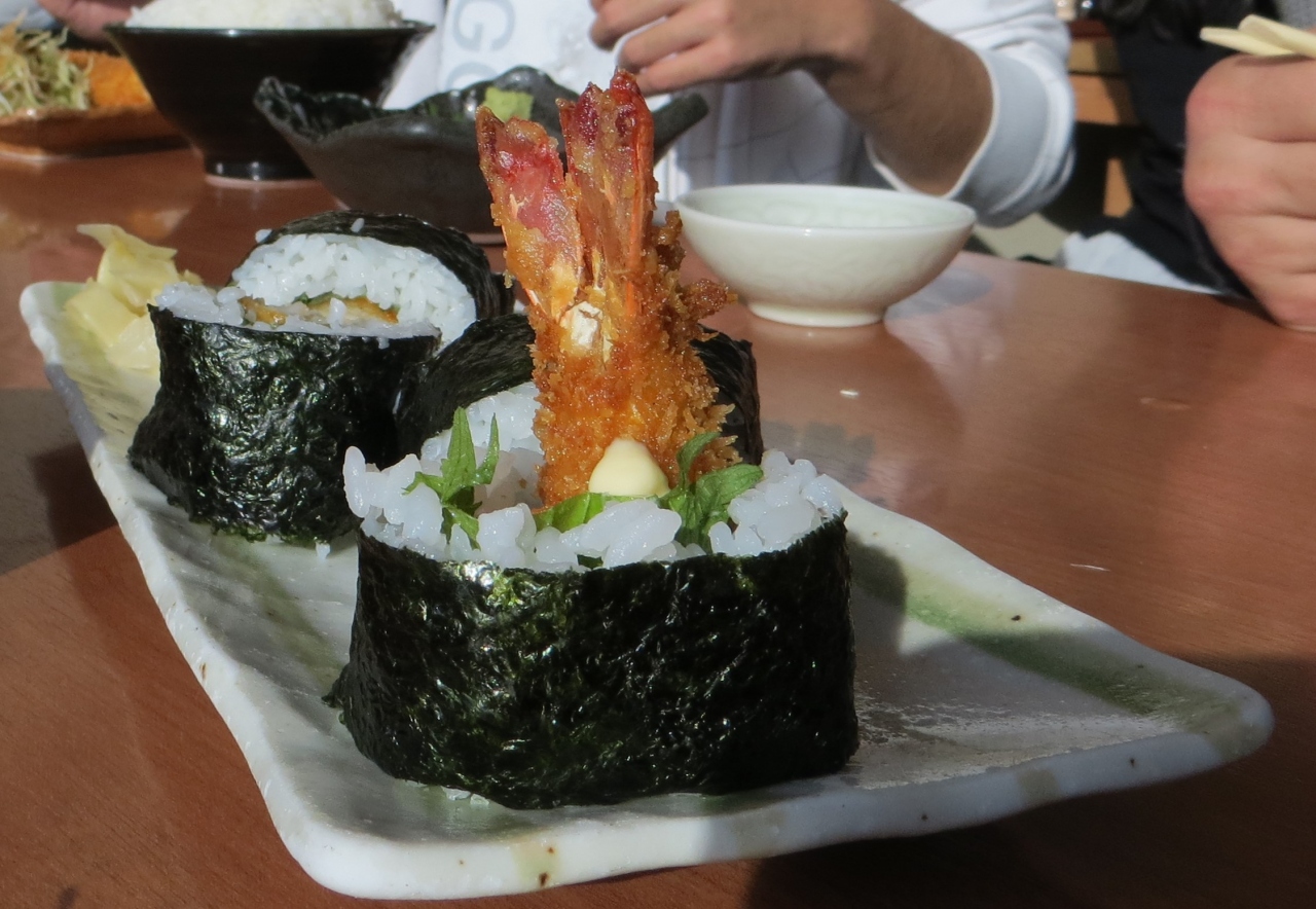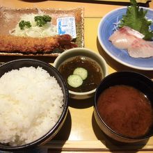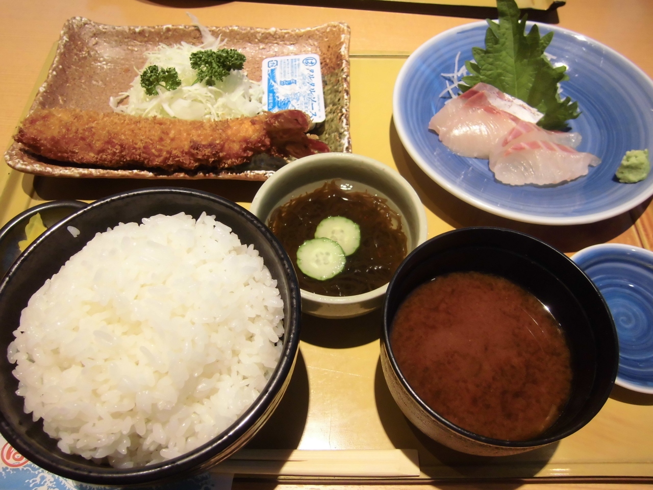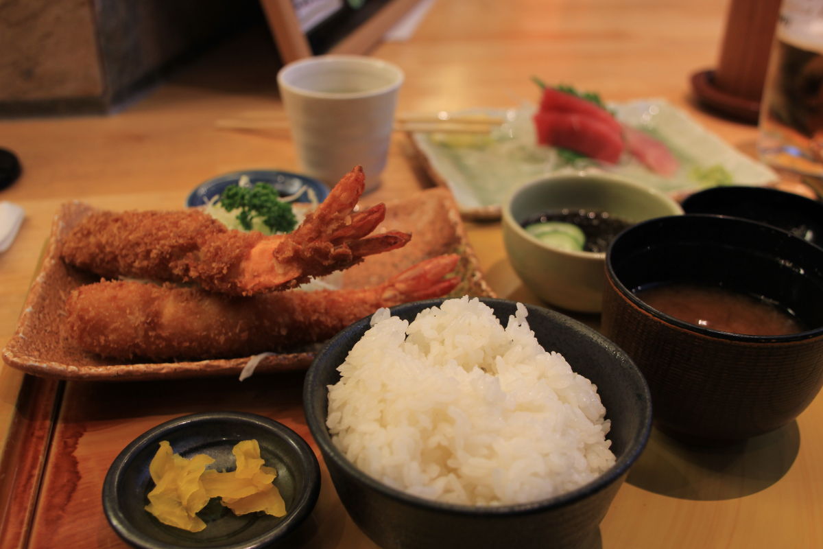 エビフライが食べたい私はエビフライが2つのった定食を、妻はお刺身定食を注文。確かにエビは、何も知らずに注文したら、出てきてびっくりのサイズでした。美味しかったです。