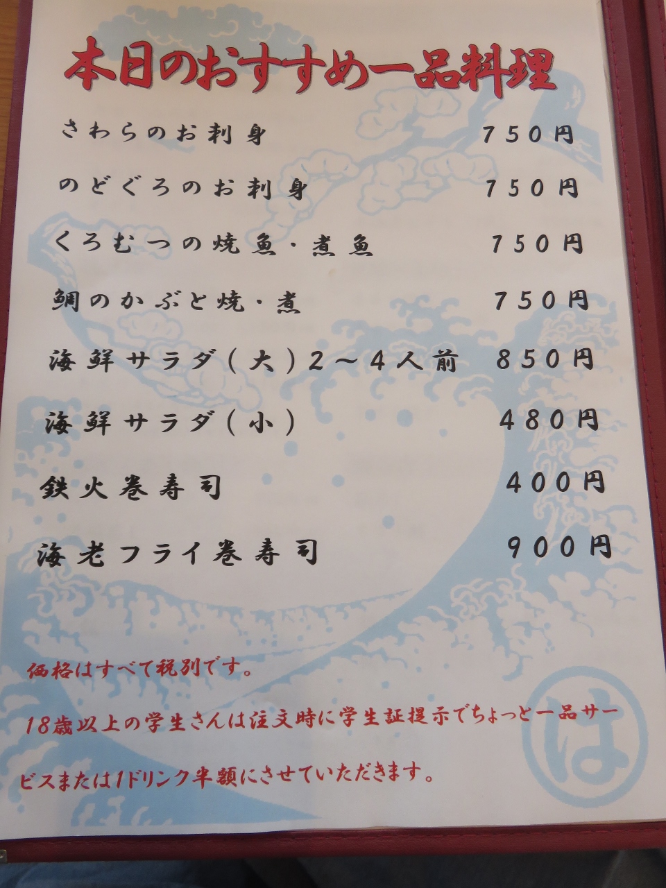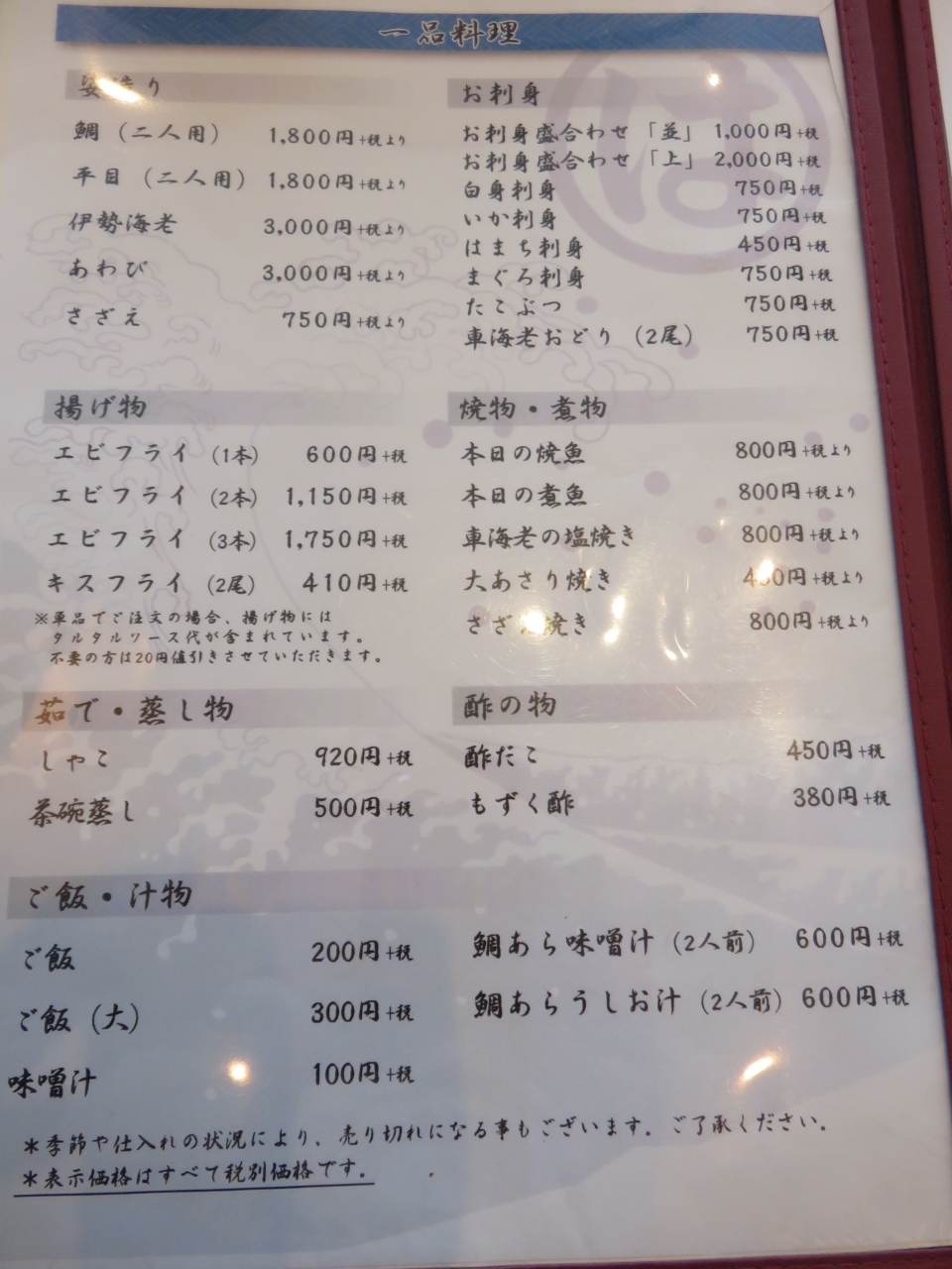 海鮮盛り合わせは小さい方を頼んだからか、刺身12~16切れで、少し少なく感じてしまいました。接客の対応があまりよくなく感じたため、よけいにそう思ってしまったのかもしれません。