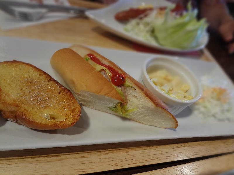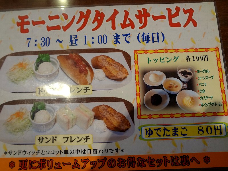モーニングサービス(飲物を頼むと無料のメニュー)は、サンドウィッチかホットドックから選べます。どちらも美味しいと思います。