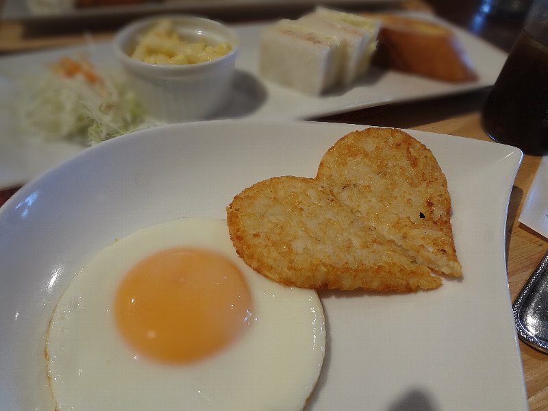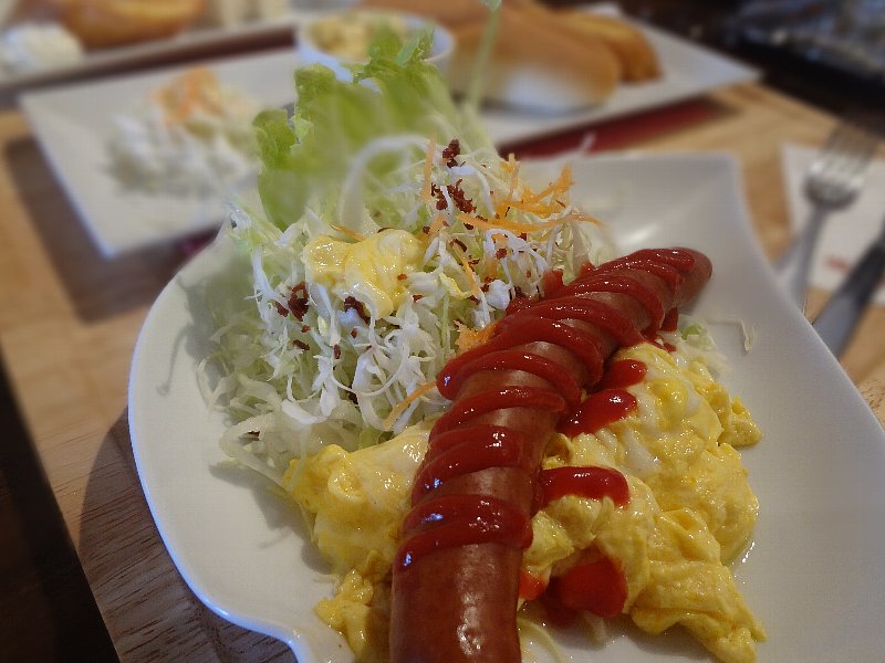 この日はブランチだったので、オプションの目玉&ハッシュポテト(200円)か、ソーセージ&スクランブル(300円)から選びました。