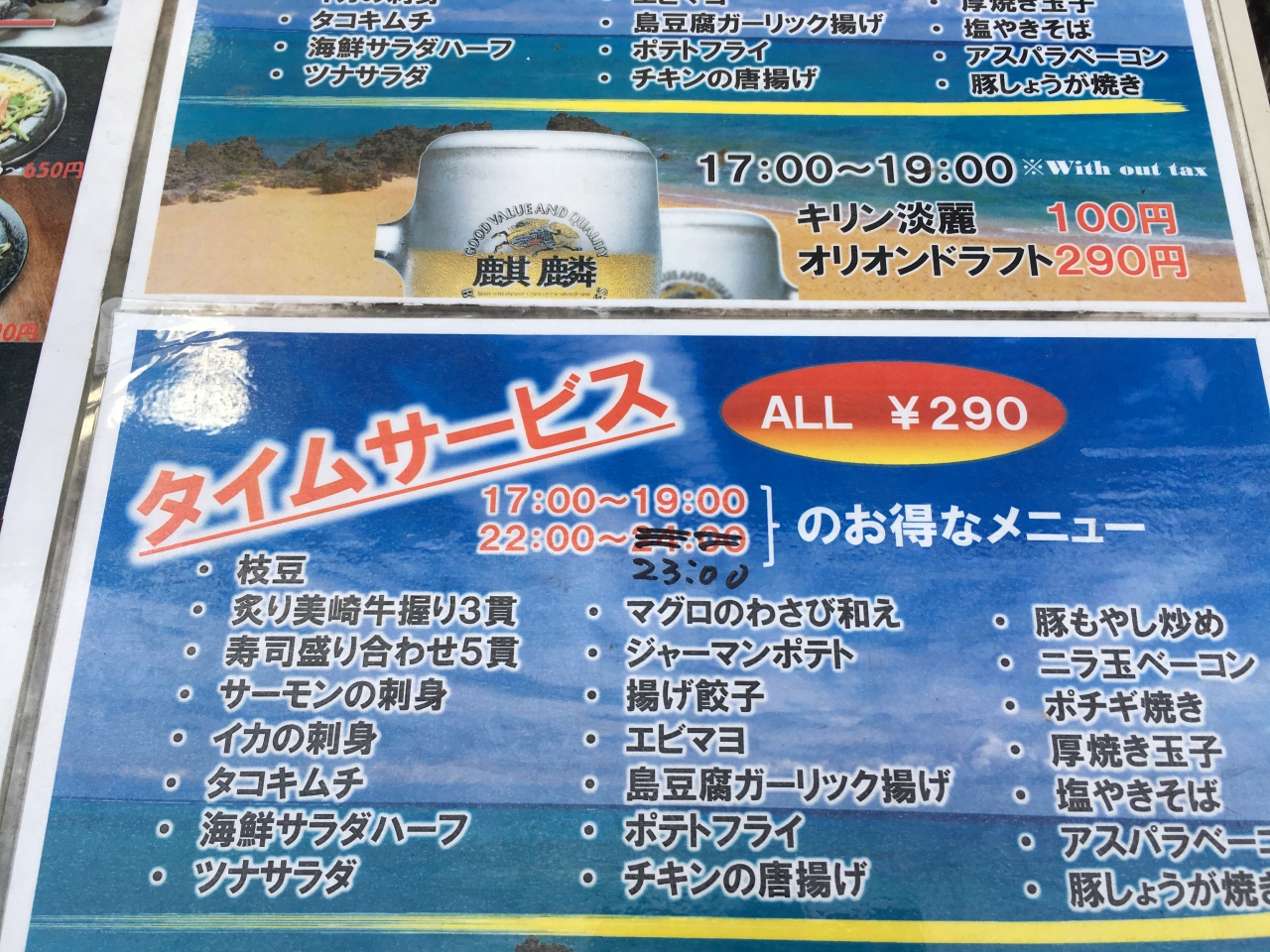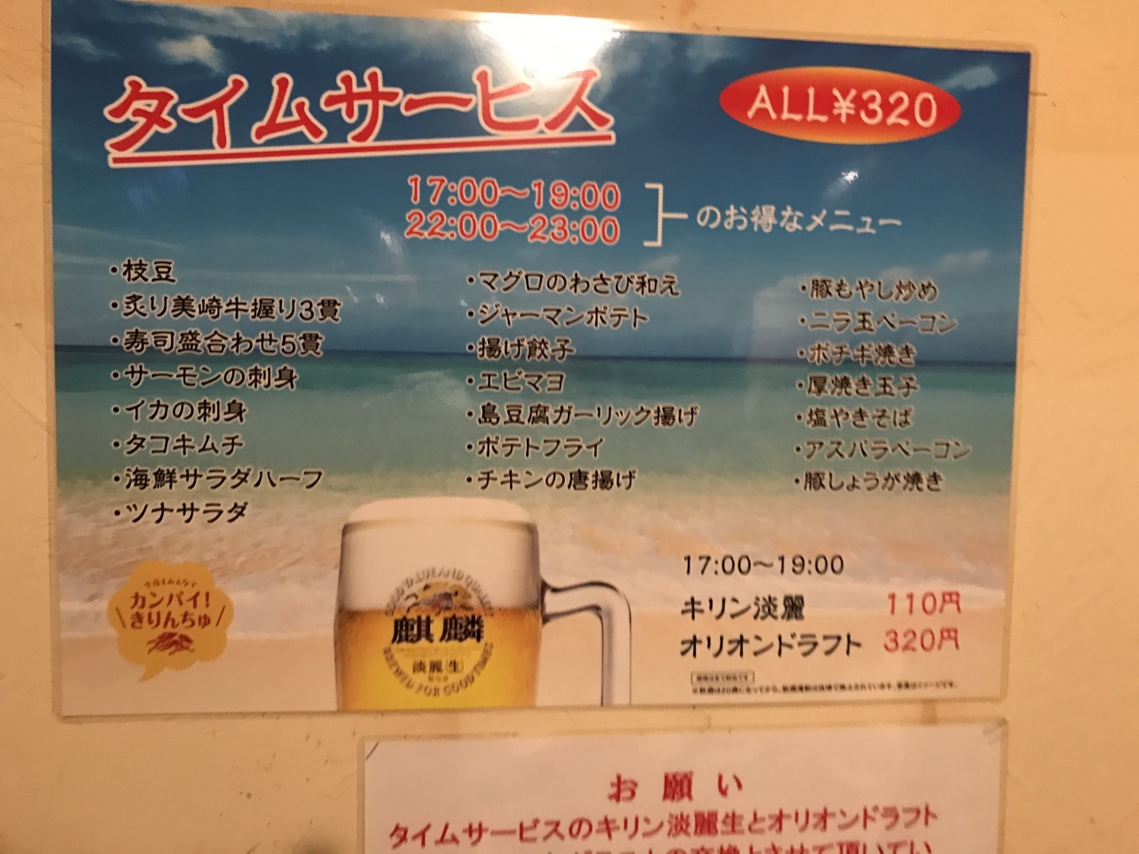 この時間帯は、オリオンドラフトビールのほか、二十品以上の料理がALL320円(キリン淡麗なら何と110円)。