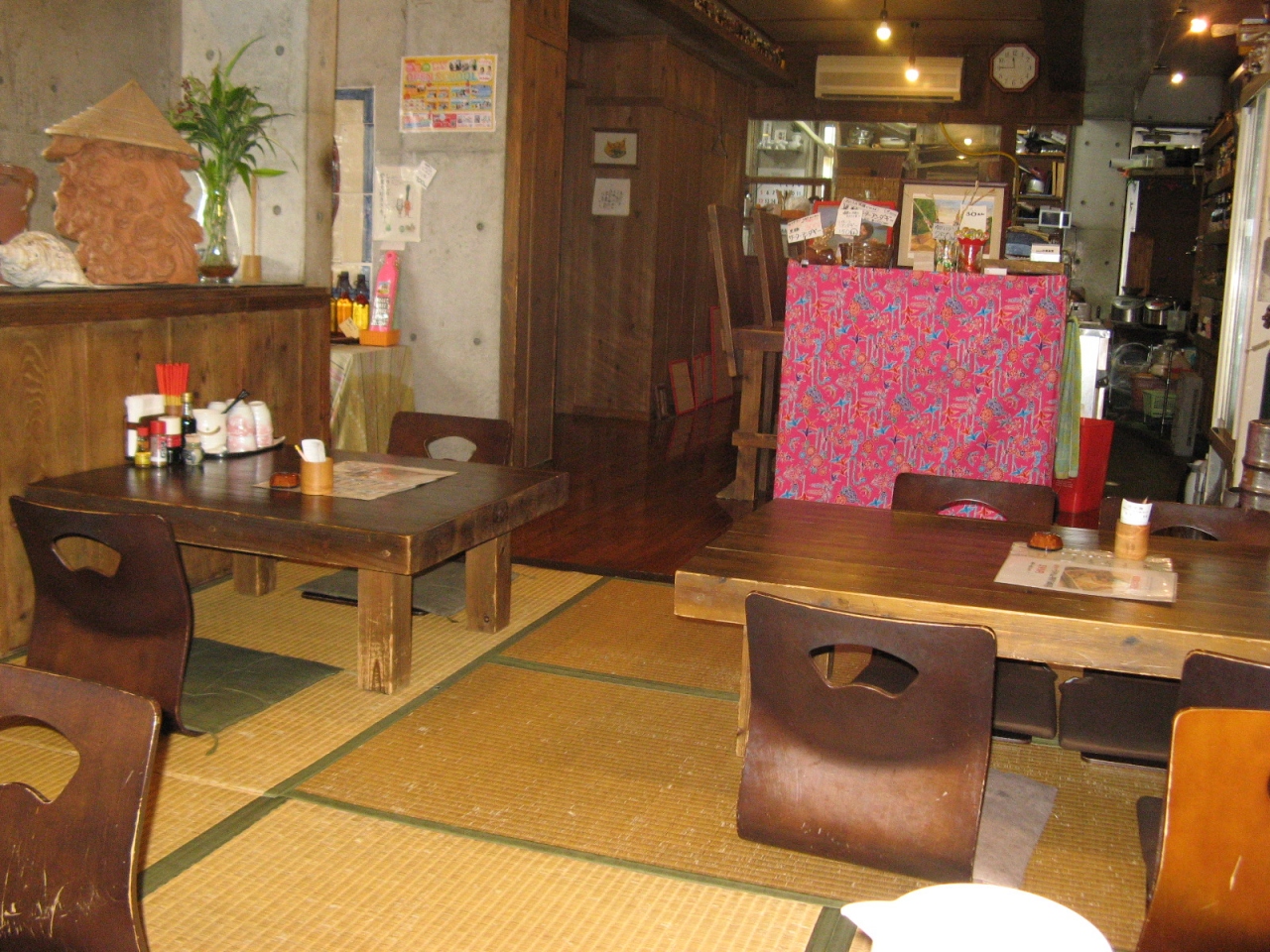 店... 続きを読む内は入り口で靴を脱いで席に上がるシステムになっていて、カウンター席とテーブル席があり、カウンターの向こうにはたくさんのお酒のボトルが置かれているところからみて、昼間は食事処、夜は居酒屋になるようなお店で、いわゆる沖縄の標準的な食堂よりはちよっと高級な感じのお店でした。