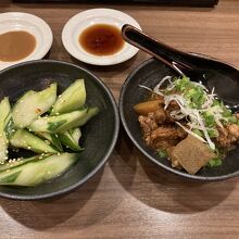 今回は、22時過ぎに入店。しかし。カウンター席を除き満席。二次会利用も多いようです。まず、満足セット(1500円)をオーダー。餃子2枚(660円)とハーフ1品(海老餃子、水餃子、煮込み、チャーシューのうち一品(390~590円くらい))、おつまみ一品(きゅうり、ナムル。酢モツ、塩麹キャベツ(290~390円くらい))、生ビール(アサヒスーパードライ(490円))がついてくるのでかなりコスパが良い。