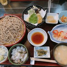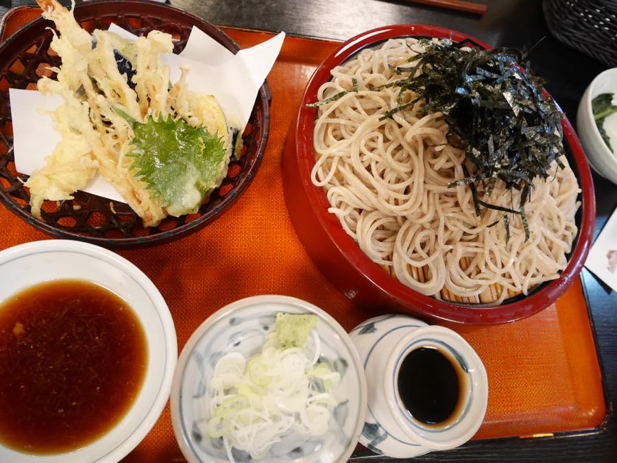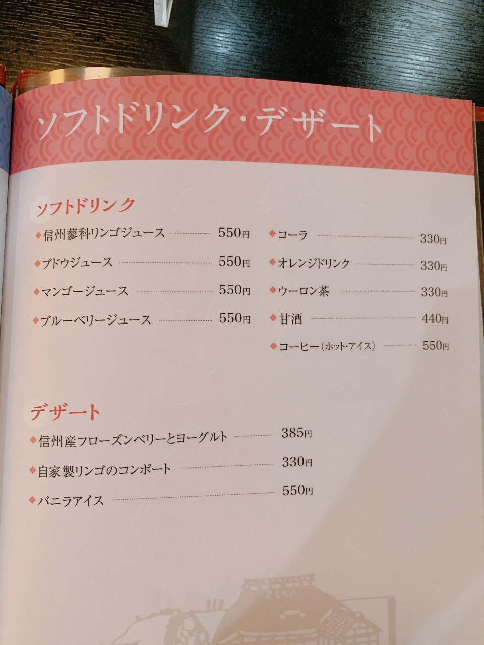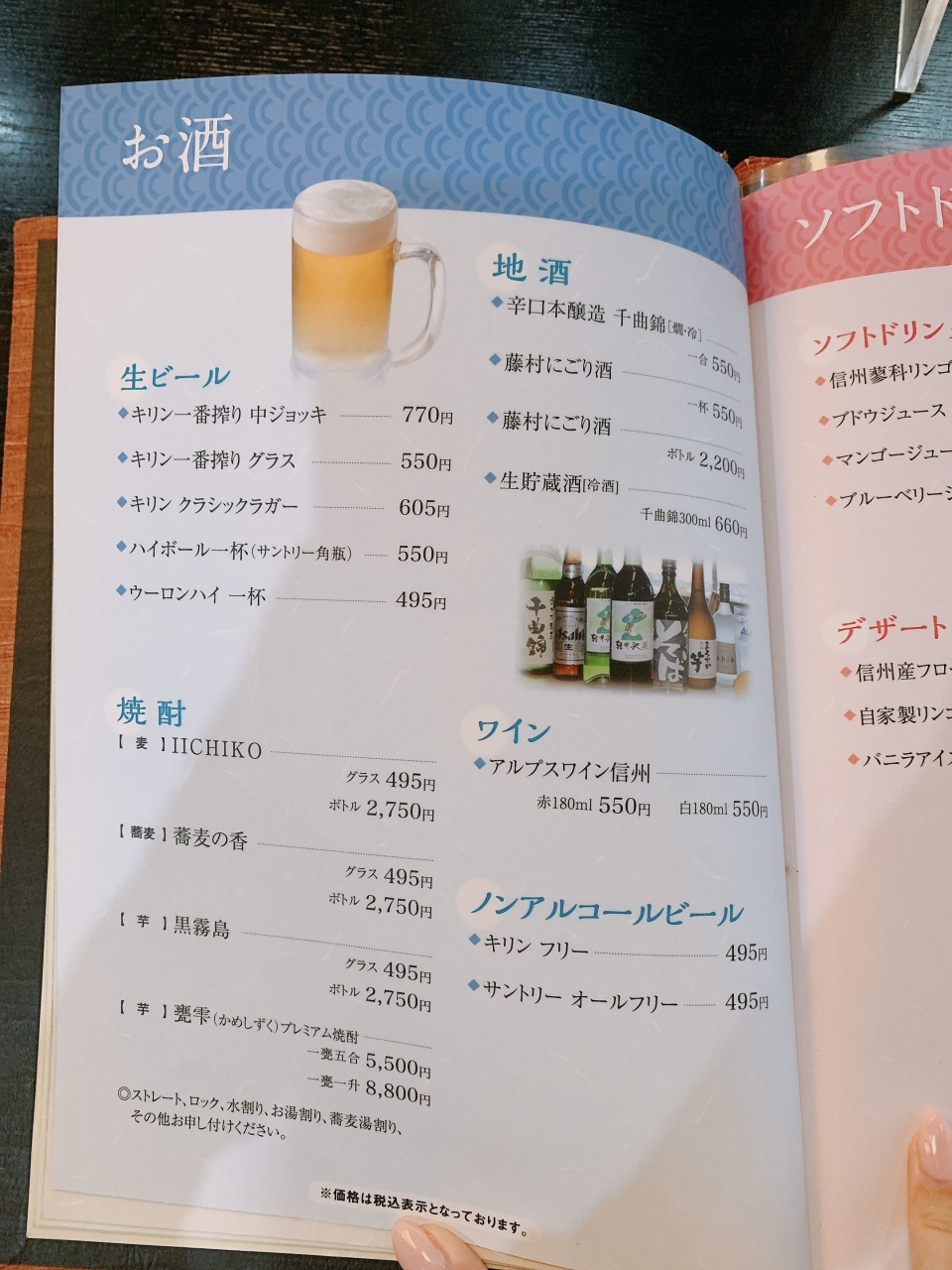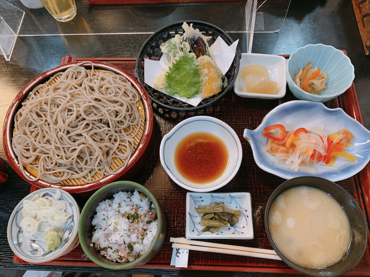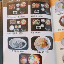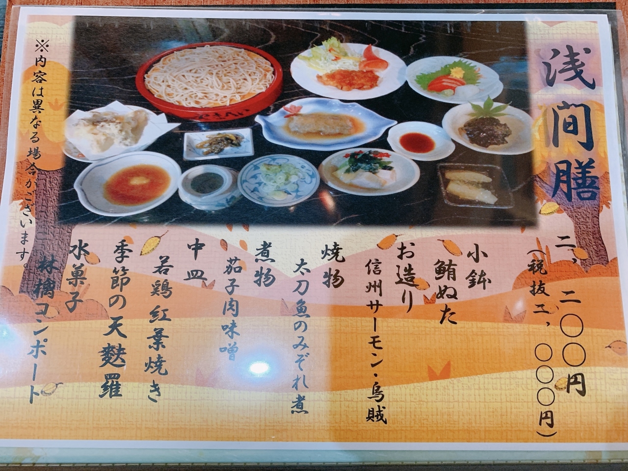 メニュー数は多く季節限定メニューからすき焼き鍋御膳、ご当地佐久鯉料理、重箱メニュー、そばの単品メニューなどあります。今回は初めてだったので、どれを選べばいいのか迷いいましたが前のほうのページにあったそば御膳 1,980円を注文。天ぷら、野沢菜ご飯、もりそば、山菜三種、小鉢、味噌汁、香の物、水菓子という内容でした。