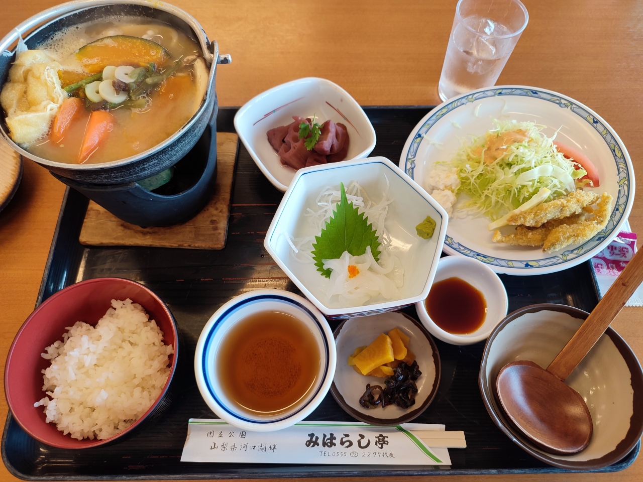 お昼ご飯は、ほうとう定食をいただきました。ほうとう定食は、ほうとう鍋に、白いごはん、若鮎の甘露煮、レンコンの煮物とボリュームたっぷりの定食です。お腹いっぱいになりました。なかでも若鮎の甘露煮は本当に美味しかったです。お土産にも買って帰りました。
