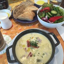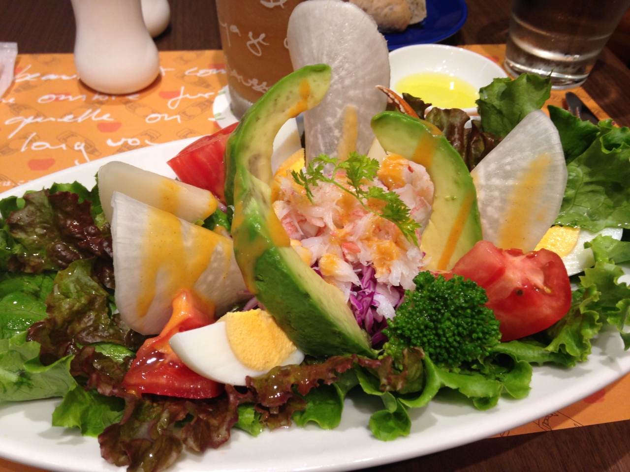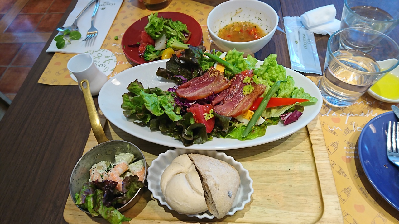 わが家は毎回同じみのベーコンの乗っているサラダのセットとハニーレモンソーダ、デザート盛り合わせ的なものを頼みました。