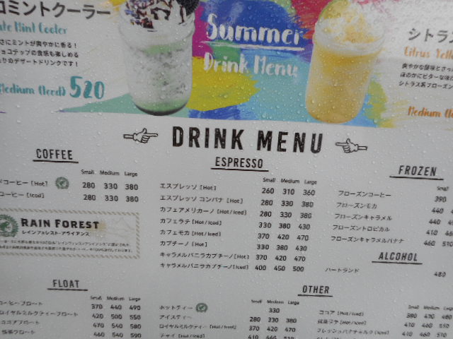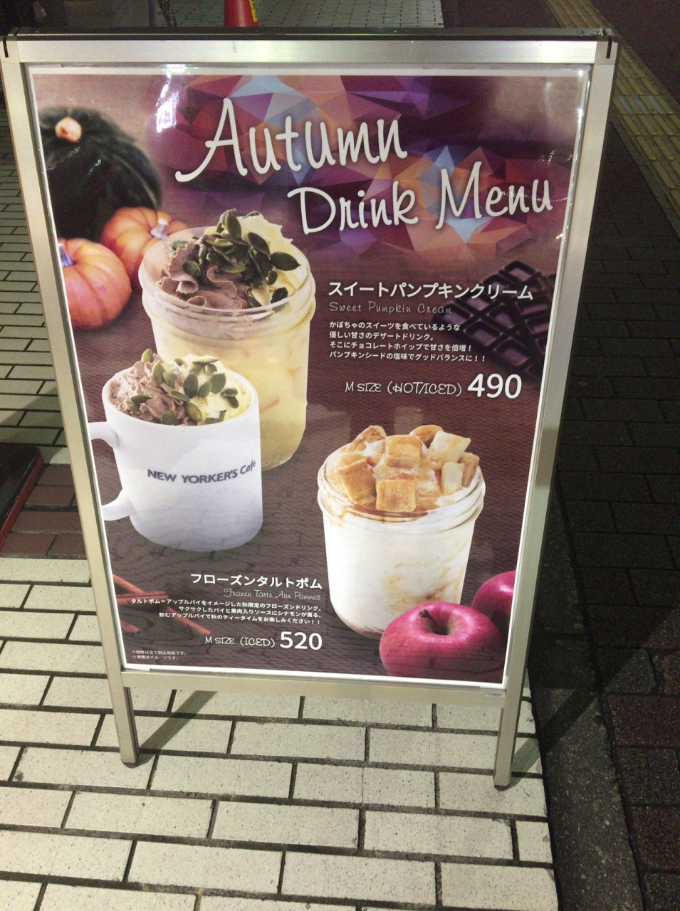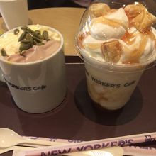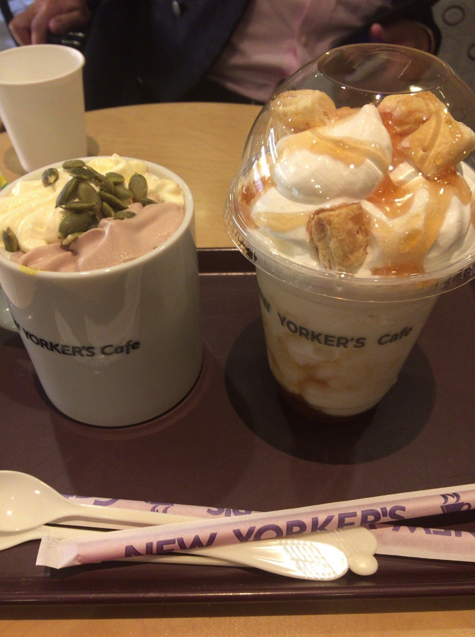秋バージョンのホットのスイートパンプキンクリームと、フローズンタルトボムを夫と飲みました。パンプキンの方はパンプキン味のホットミルクの上にそれほど甘くない白ホイップと、パンプキン味のホイップがのせてあり、その上にかぼちゃの種がのせてありました。甘いのが欲しい時に丁度いい飲み物です。またフローズンタルトポムは一番底にアップルソースその上にバニラフローズン、その上に山盛りの生クリームで一口サウズのパイとアップルソースがかかっていました。冷たくて、甘すぎず、これも美味しいです。