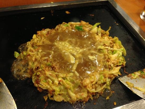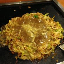 「もちキムチお好み焼き」は2×1?くらいの切り餅がごろごろ入っていて、とてもおいしかったです。キムチの味はあまりしませんでした。