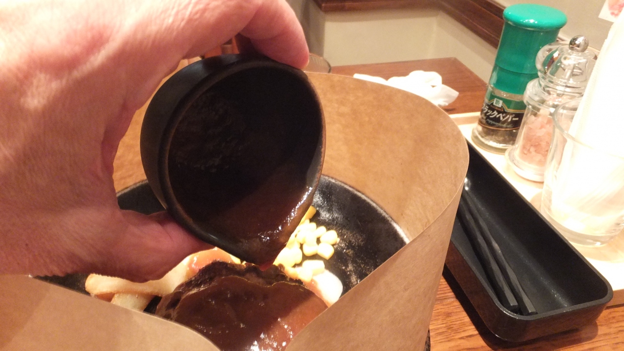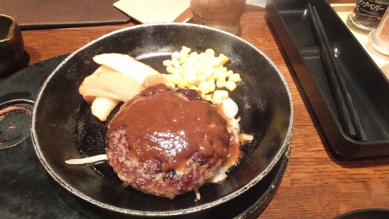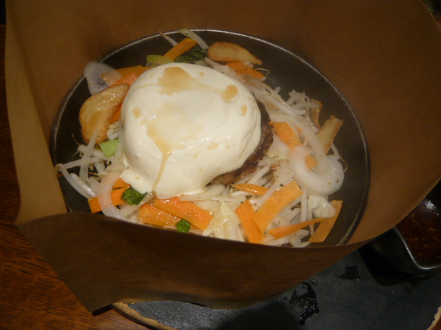 ソースは4種類あるそうですが、デミグラスソースにしました。ごはんと味噌汁のセットです。箸でいただくスタイル。鉄板はかなり熱く、なかなか冷めません。