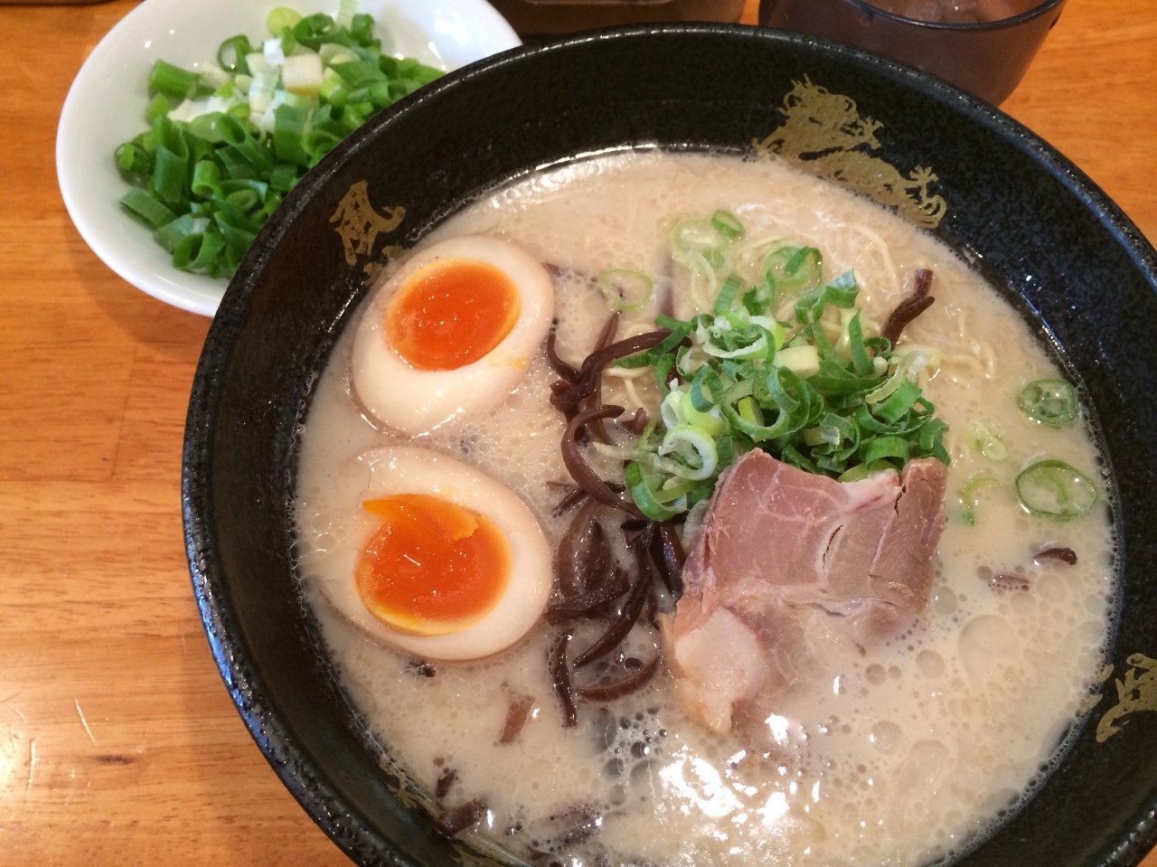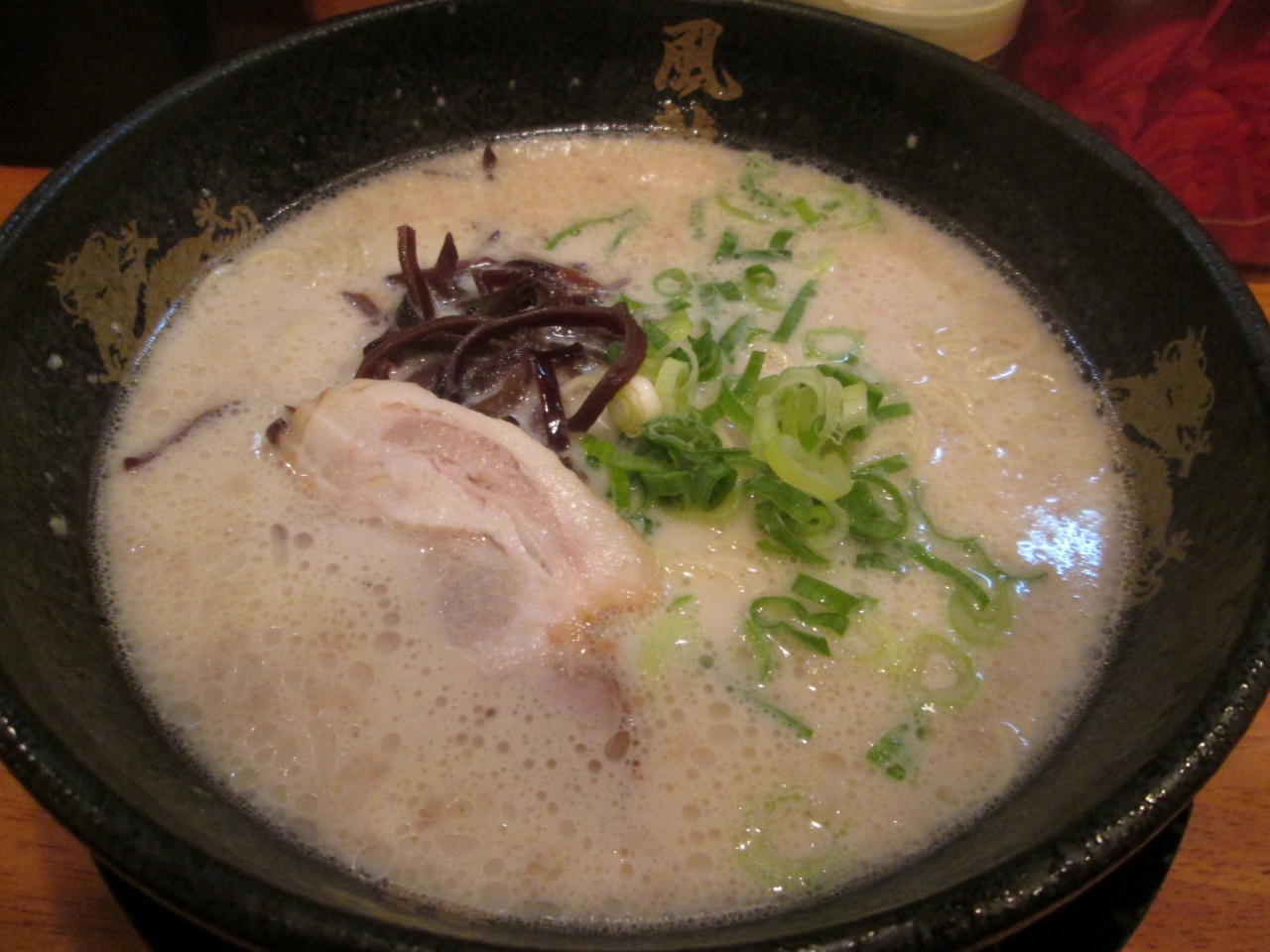 さすが細麺の博多ラーメン、ほんの数分で出てきました。スープはしつこすぎない豚骨。具は味玉、チャーシュー一枚、キクラゲの細切り、ネギ。そして、ネギが升に別に入って出てきました。これがおまけだったのか?薬味を加えながら色々な意味な味を楽しめます。