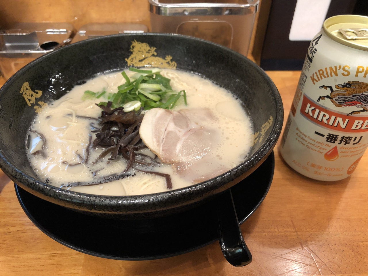 オーソドックスなとんこつラーメンと缶ビールを券売機で買い店内へ