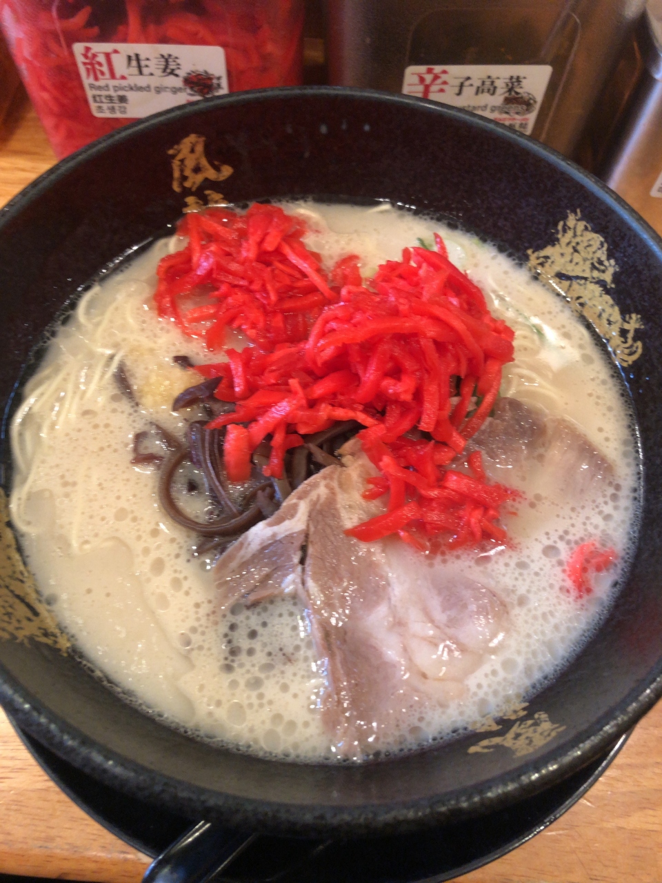 カウンター席に着くと麺の硬さの好みを聞かれます。初めてきたお店なので、普通をお願いし、テーブル上の薬味を物色。紅生姜、にんにく、高菜、鷹の爪などが自由に使えます。
