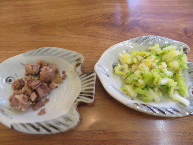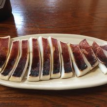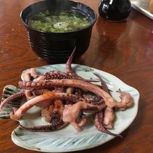 この日はオヤジさんとおばちゃんの2名で切り盛りしているので、料理の提供が遅くなり、ビールをアオリながら待ってたんですが、待たせたって事で、イカゲソの煮込みをサービスで提供してくれました。