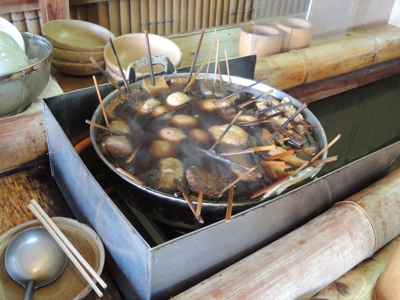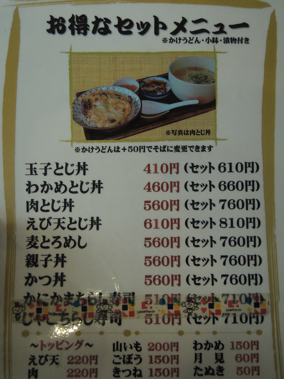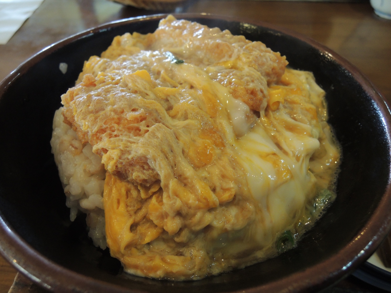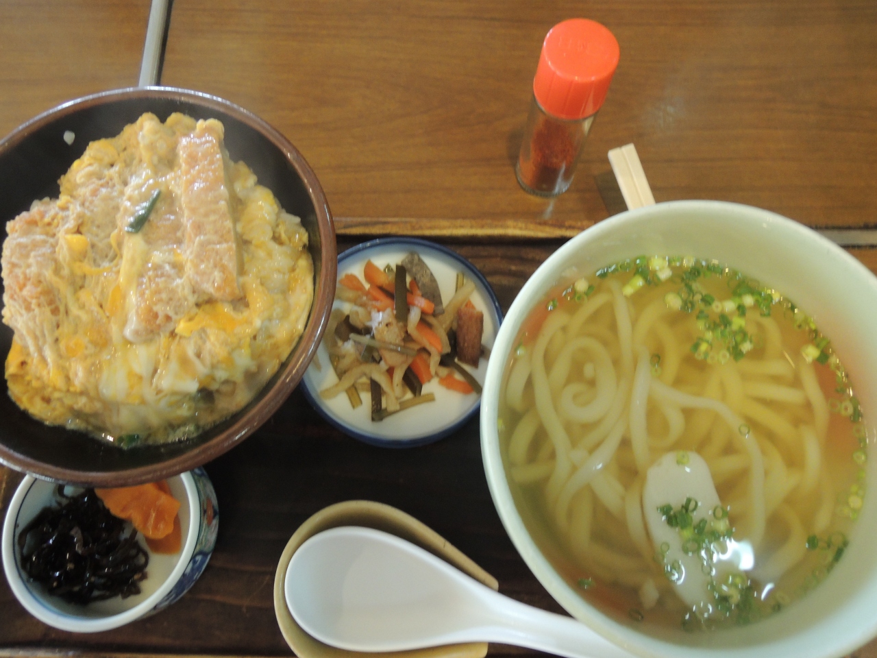 店内は長方形の形をしたカウンター席、テーブル席と座敷があります。お得なセットメニューの中から、かつ丼とかけうどんのセット(760円)をオーダー。かつ丼のトンカツは衣の厚さが少なく、肉の持つ旨みがしっかり味わえる。ご飯ととんかつの玉子とじのバランスがとてもいい。かけうどんの太さは普通だがコシが強く感じられる。漬物やこんにゃくや人参などの和え物まで付いている。このセットでこの値段はコスパが高い。帰りがてら、カウンター席でちらっと見えたおでんも美味しそうでした。